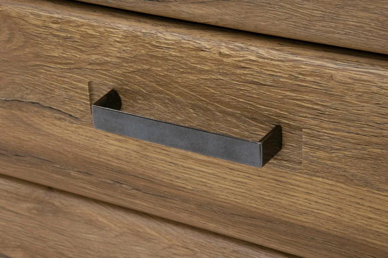 - Fronty drzwiczek oraz szuflady są wykonane z połączenia płyty wiórowej i płyty MDF. Wykończenie frontów folią PVC w barwie dąb wotan podnosi jakość oraz trwałość mebla oraz nie sprawia żadnych trudności w utrzymaniu w czystości.