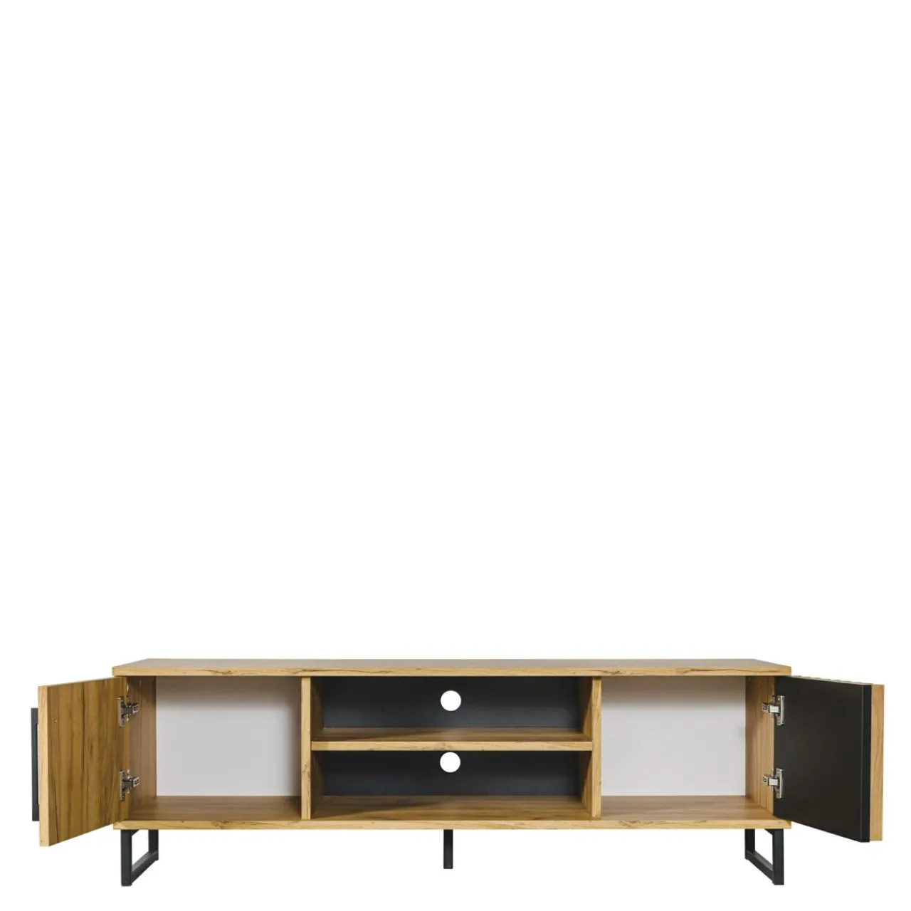 W otwartych wnękach pomieścisz dekoder oraz odtwarzacz DVD. Kable przeciągniesz przez niewielkie otwory w tylnej zabudowie – będą niewidoczne, a Ty zachowasz codzienny porządek.