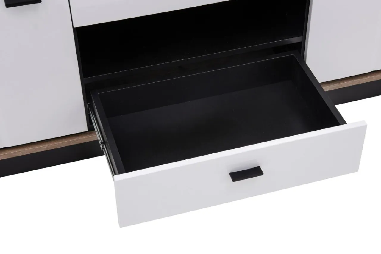 Klasyka zaprezentowana w modernistycznym wydaniu. Bryły skonstruowane są w przemyślany sposób: korpusy w jasnym kolorze dębu postawione są na czarnych podstawach, a całość zamykają białe fronty.