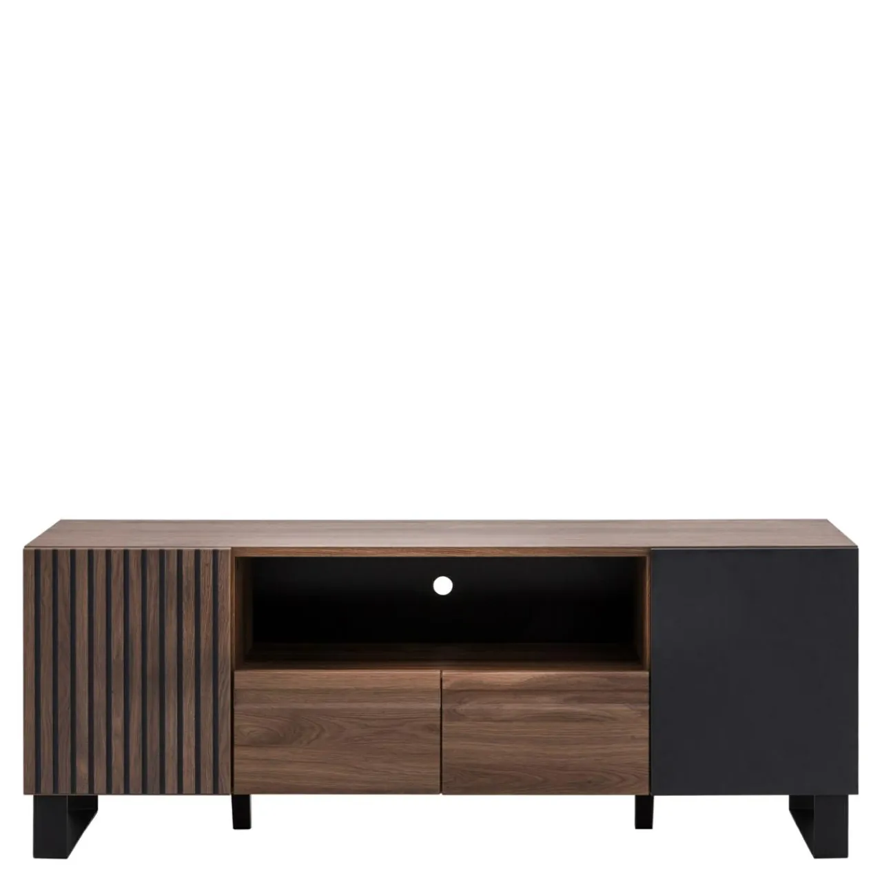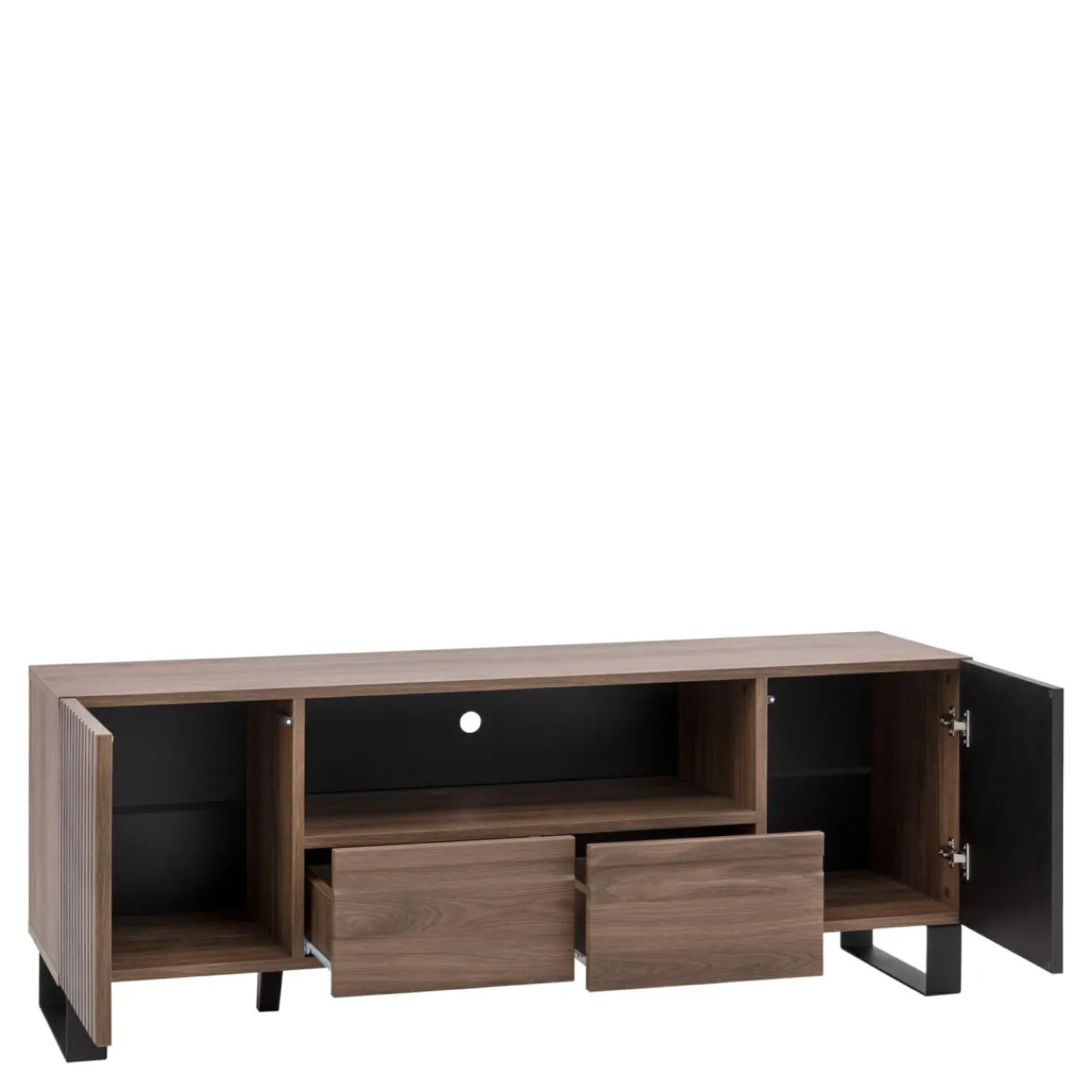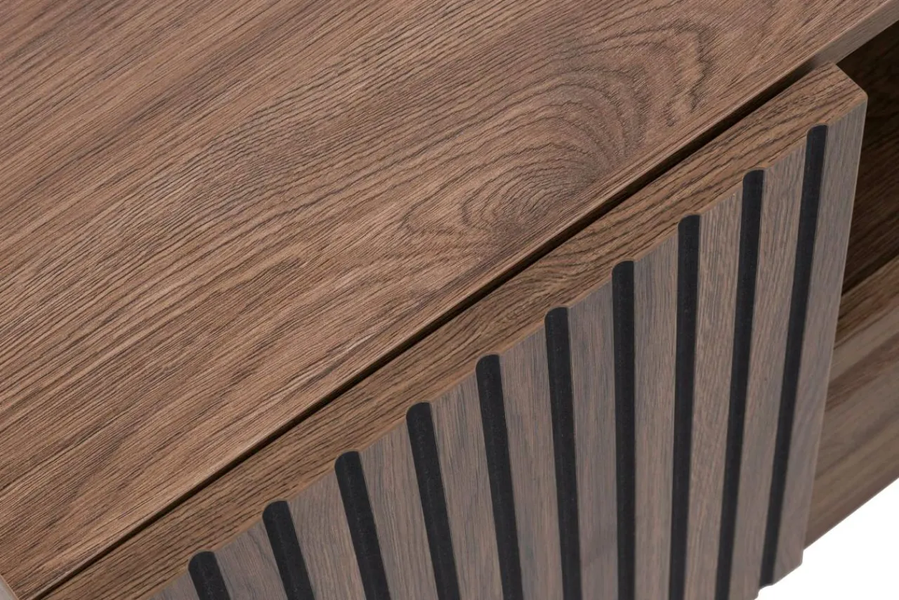 Szafka RTV BOSTON dodaje wnętrzu elegancji. Dzięki zastosowaniu efektu lameli na froncie szafki, kącik wypoczynkowy nabiera nietuzinkowego charakteru.
