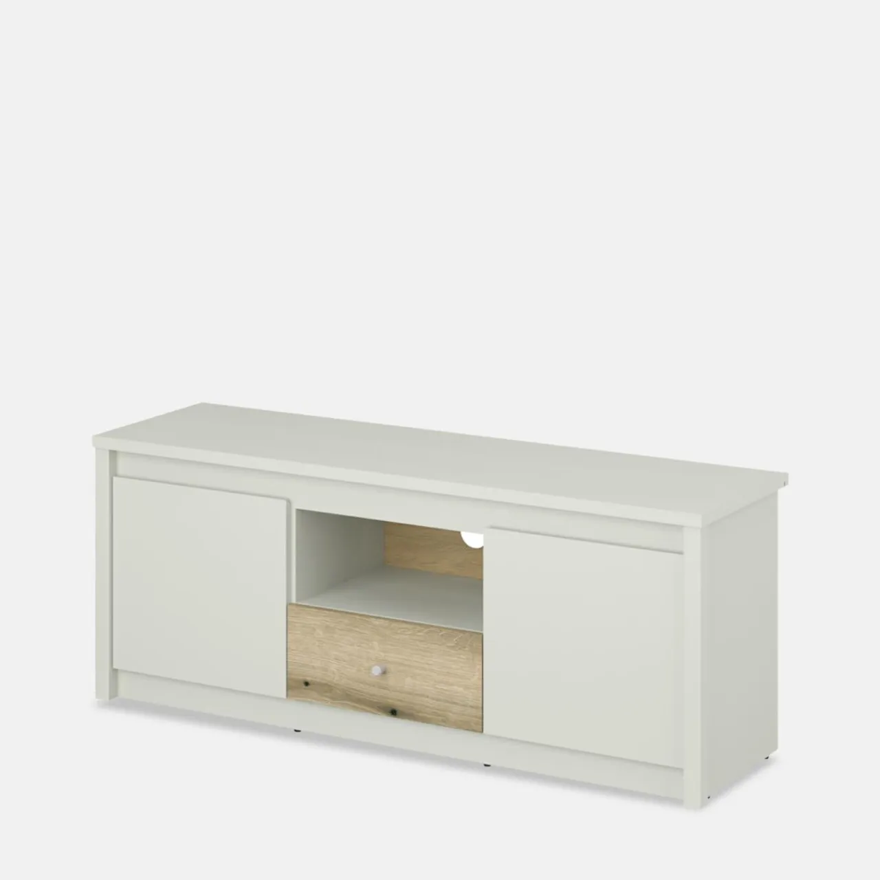 - Dwie zamykane szafki oferują miejsce dla większych przedmiotów, które chcesz ukryć, dbając o porządek w salonie.