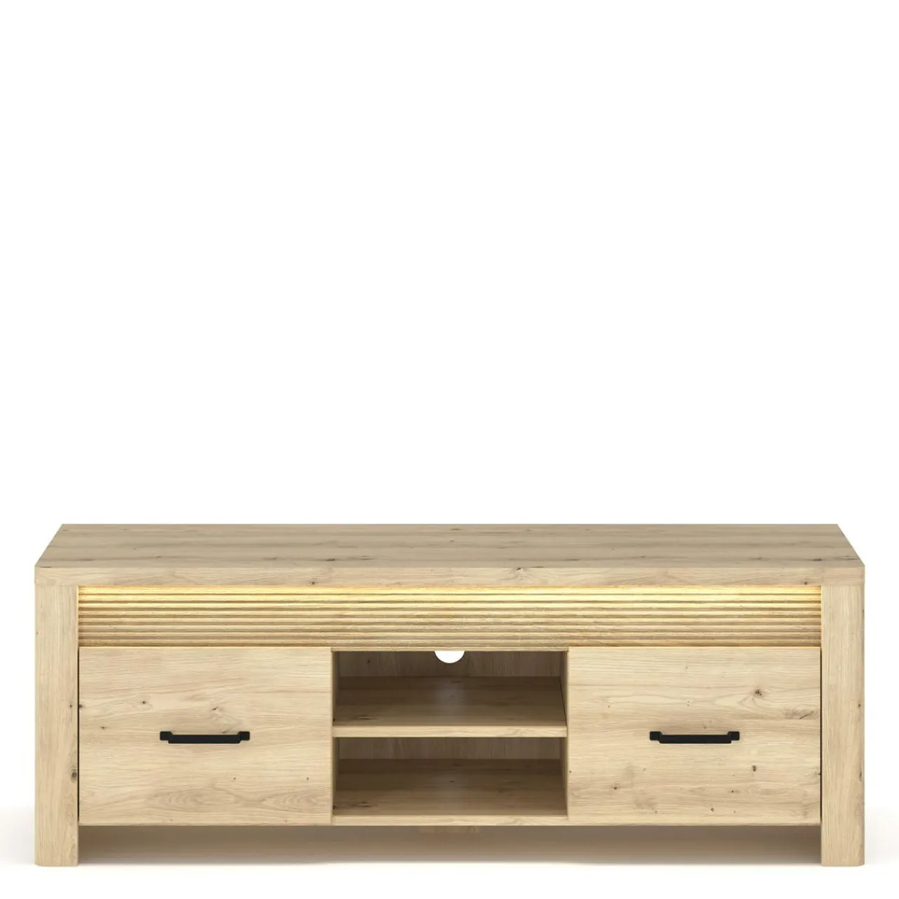 Szafka RTV MORIS posiada dwie szuflady oraz półki otwarte umieszczone w centralnej części mebla – w sam raz na kolekcje filmów, dokumenty, gazety lub przydatne przedmioty osobiste.