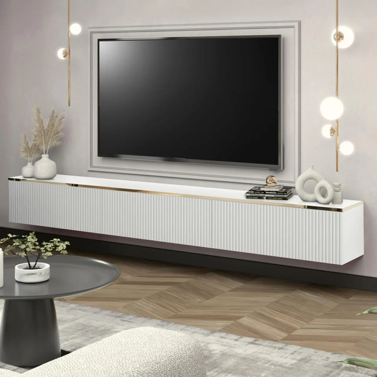 Meble wiszące – ryflowanie i złote elementy