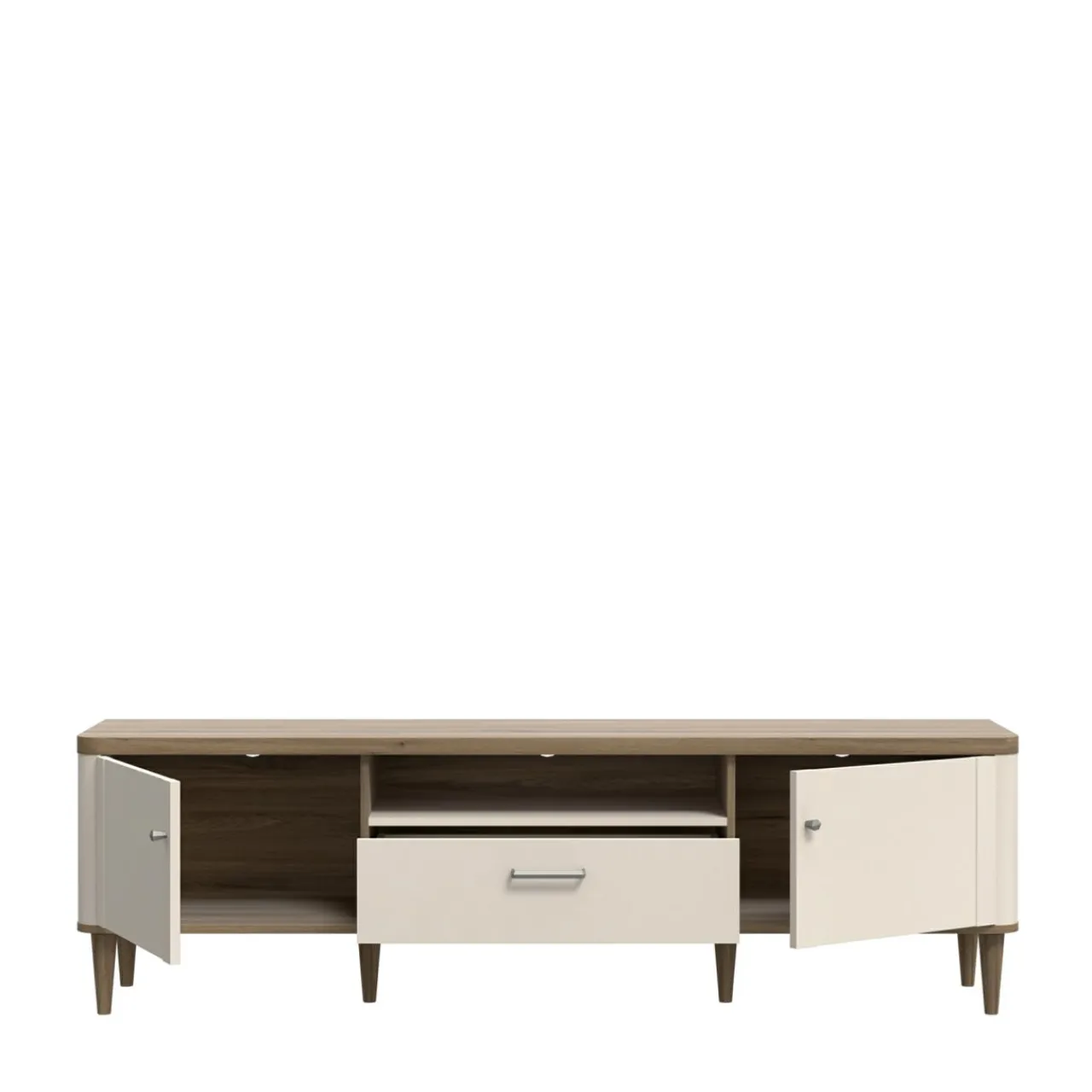 - Ciepły piaskowy beż z elementami dębu valencia tworzą nowoczesną kolekcję, sprzyjającą odpoczynkowi.