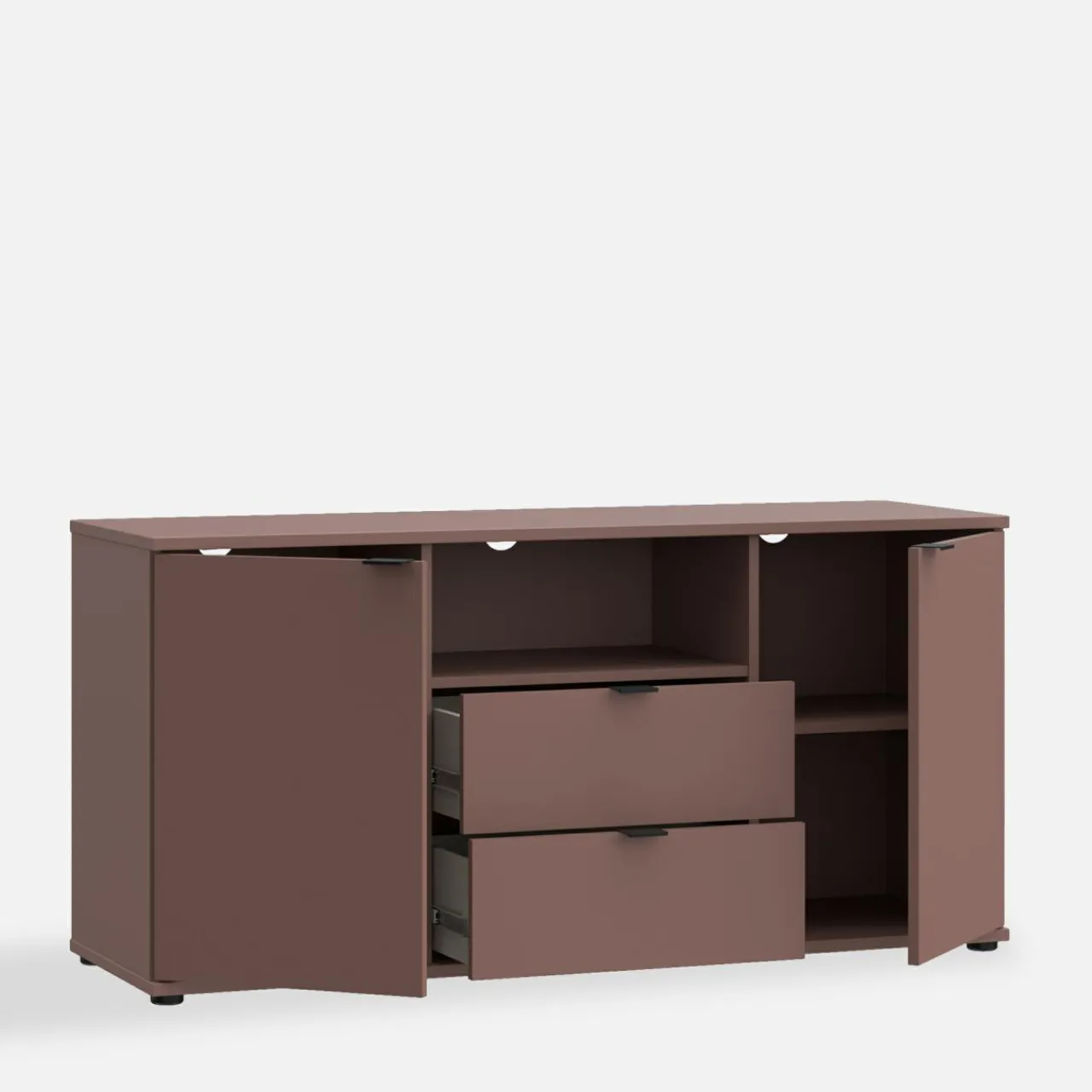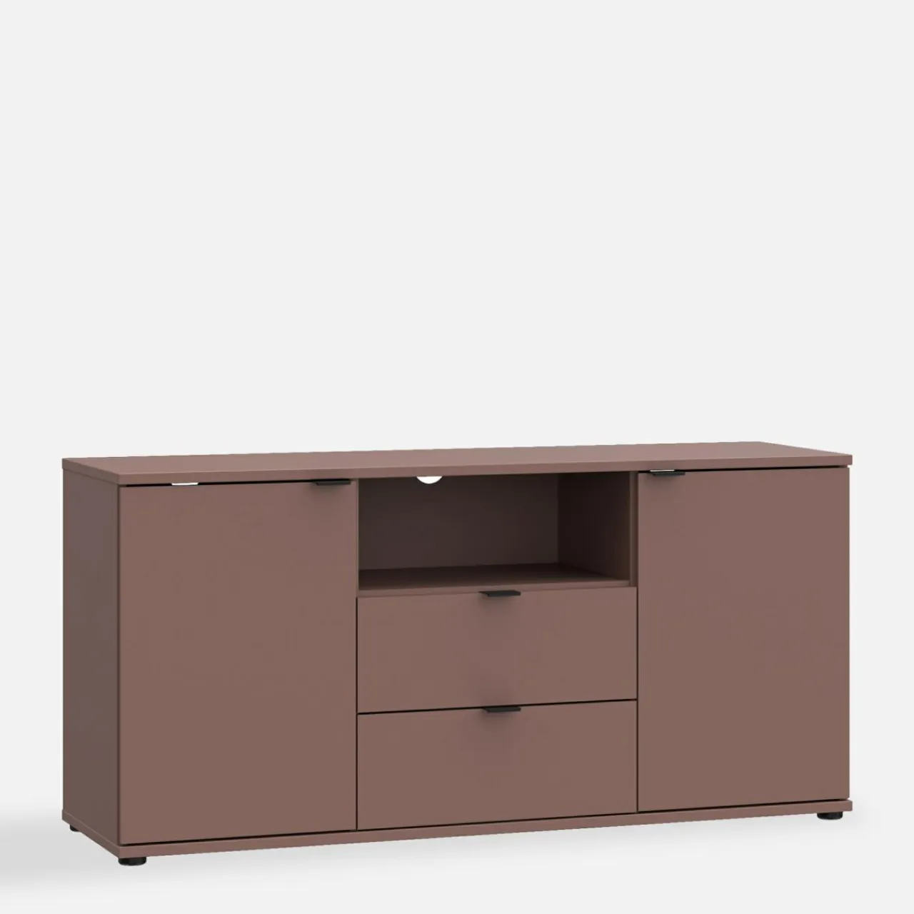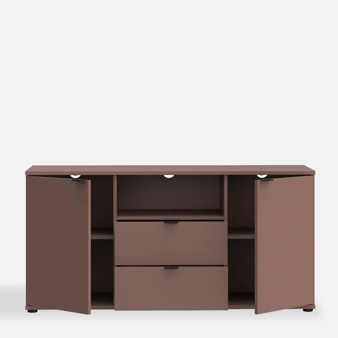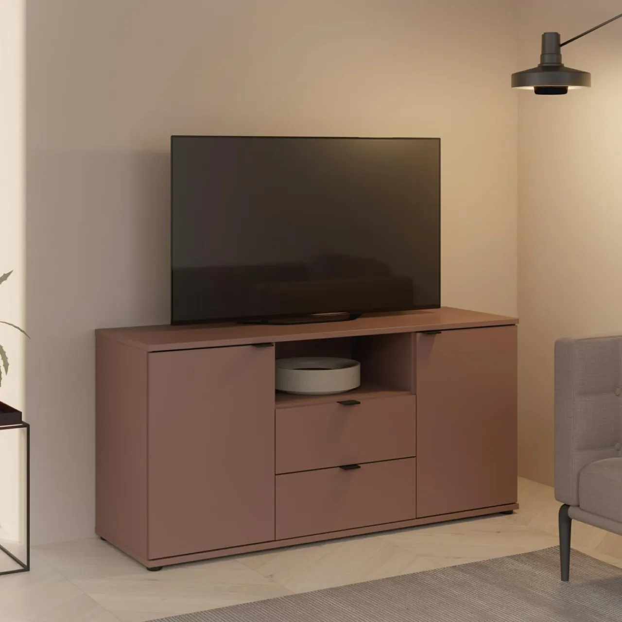 Szafka RTV GANYMEDE w odcieniu terrakoty zapewnia miejsce na sprzęt elektroniczny i akcesoria. Zamykane szafki ukryją większe przedmioty, a szuflady i wnęka ułatwią organizację.