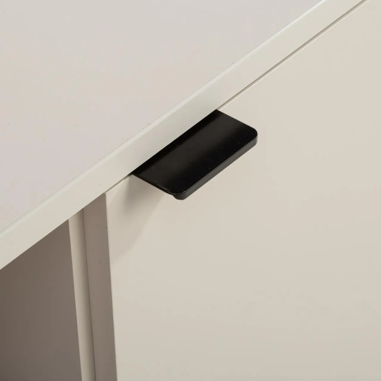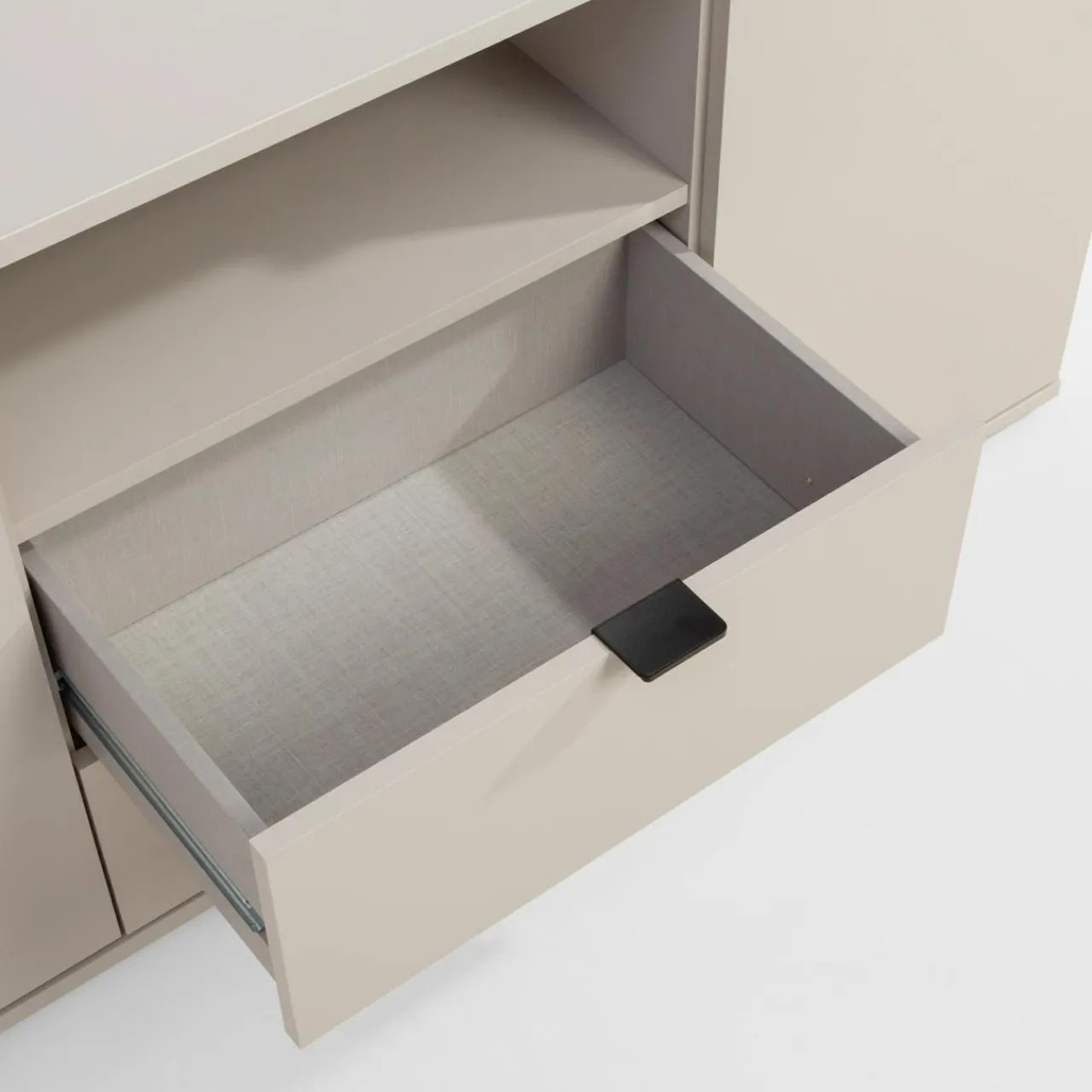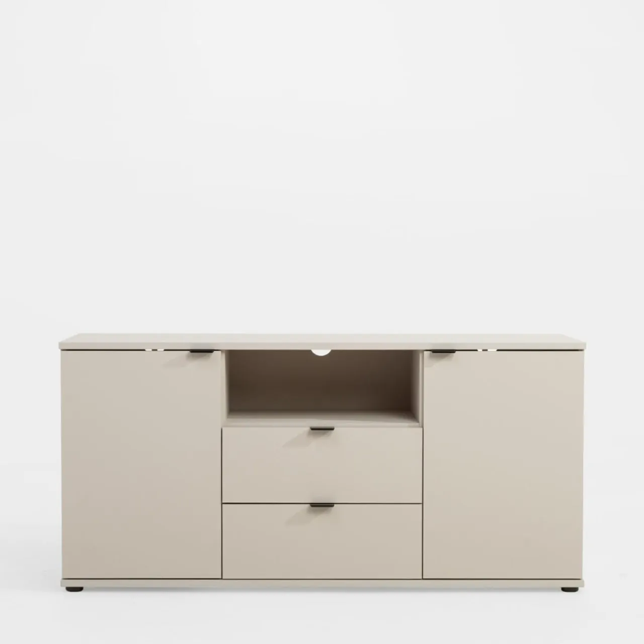 Szafka RTV GANYMEDE w odcieniu jasnego beżu zapewnia miejsce na sprzęt elektroniczny i akcesoria. Zamykane szafki ukryją większe przedmioty, a szuflady i wnęka ułatwią organizację.