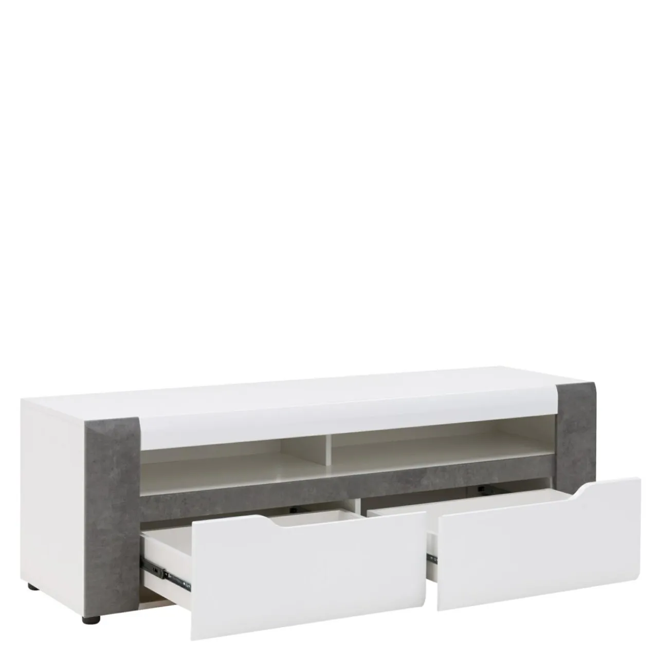 Szafka RTV BRANDO posiada półkę otwartą pod blatem podzieloną na dwie równe części oraz 2 pojemne szuflady. Na szczególną uwagę zasługuje fakt, że szafka została wyposażona w wysokiej jakości prowadnice kulkowe.