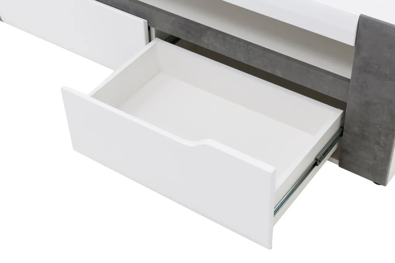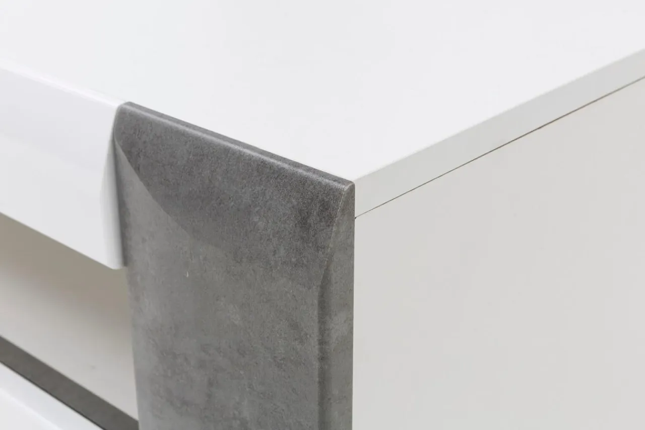 Korpus szafki oraz blaty zostały wykonane z laminowanej płyty meblowej, natomiast fronty to MDF z wykończeniem w białym połysku. Modne zestawienie bieli oraz szarości betonu dodaje szafce BRANDO nieco surowości złagodzonej poprzez linię podchwytów we frontowej części mebla.