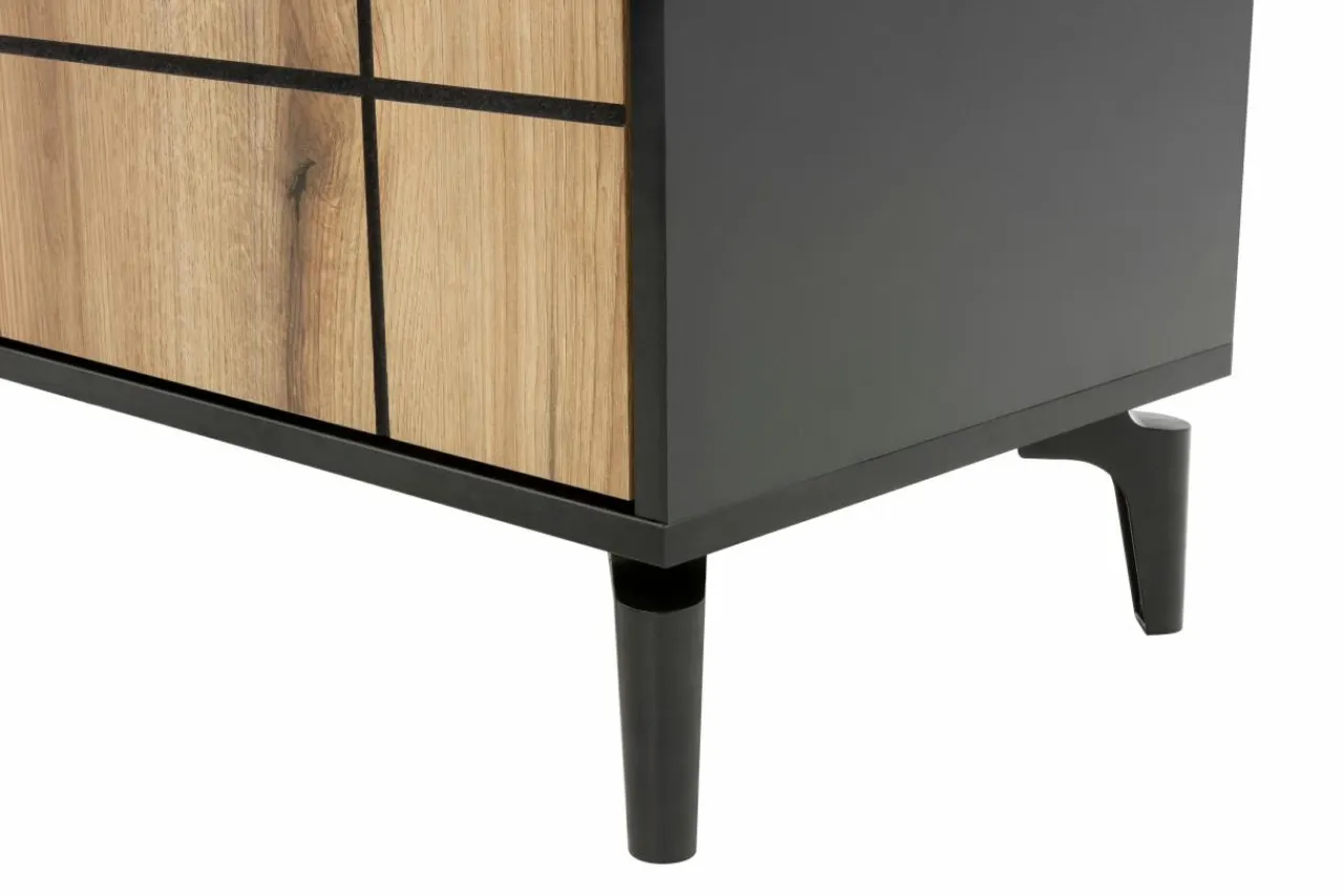 Meble wykonane z płyty meblowej wykończone są laminatem w kolorze czarnym i dąb evoke. Naturalny rysunek drewna z widocznymi sękami i słojami podkreśli przytulną atmosferę.