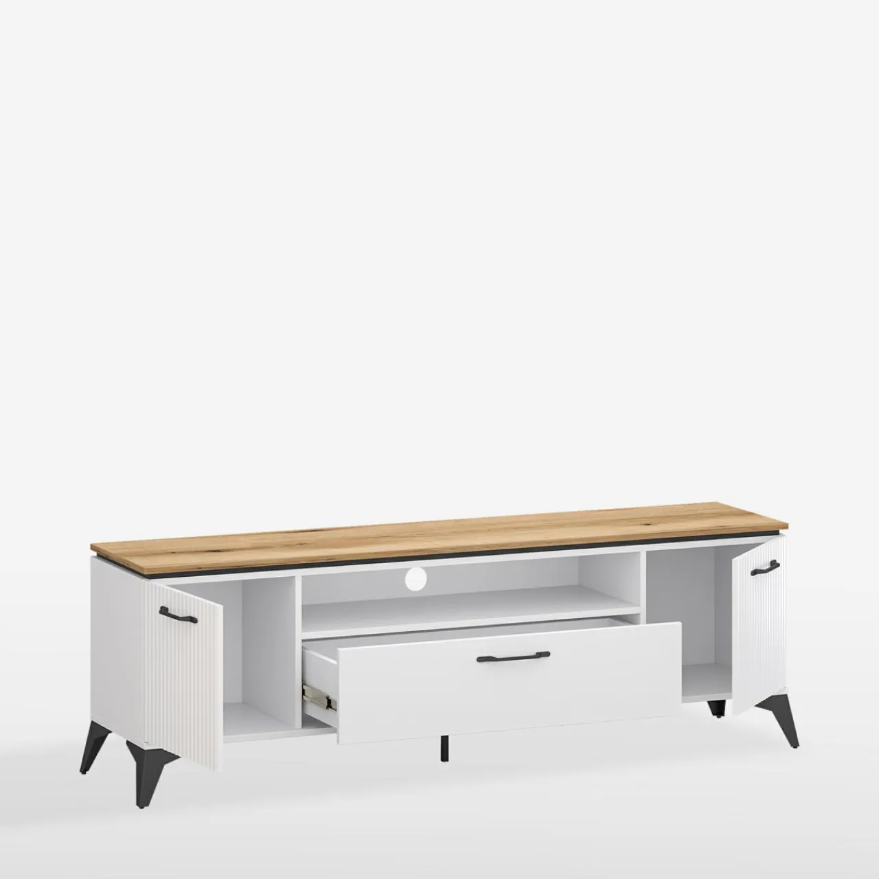 Z szafką RTV VELUTTO cały sprzęt niezbędny do telewizora znajdzie się w jednym miejscu. Poukładaj go na całej szerokości blatu, a akcesoria schowasz w zabudowanej części mebla.
