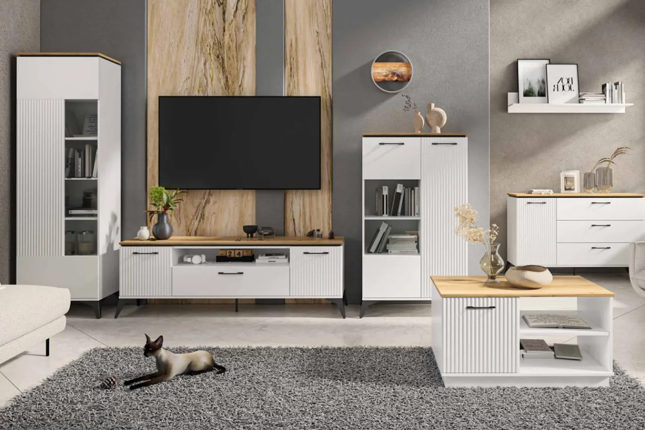 - Meblami urządzisz spójne wnętrze salonu i gabinetu domowego.
