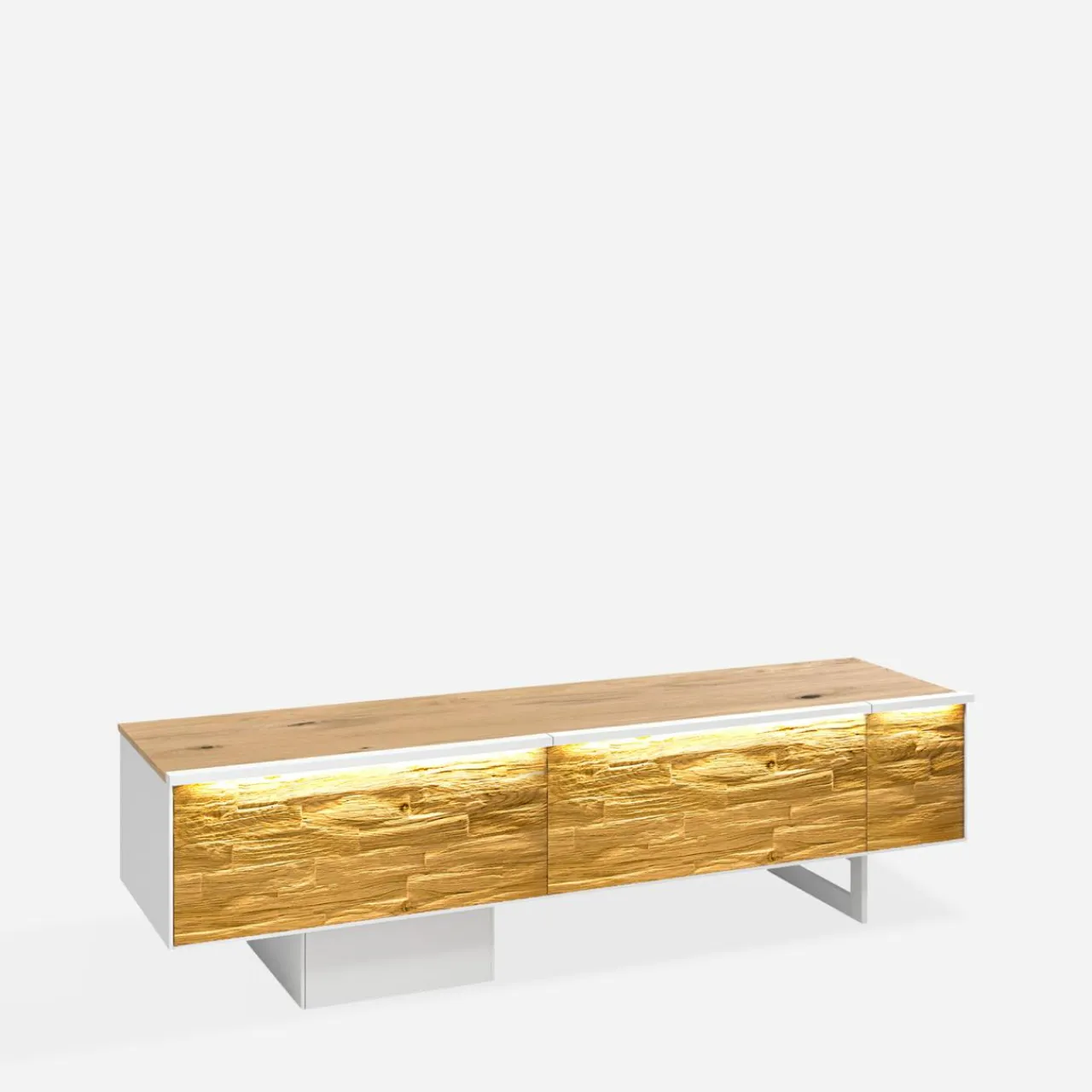 - Zanurz się w grze świateł i faktur — wbudowane oświetlenie LED w ciepłej tonacji wydobywa rysunek dębu, podkreślając ich unikalną strukturę.