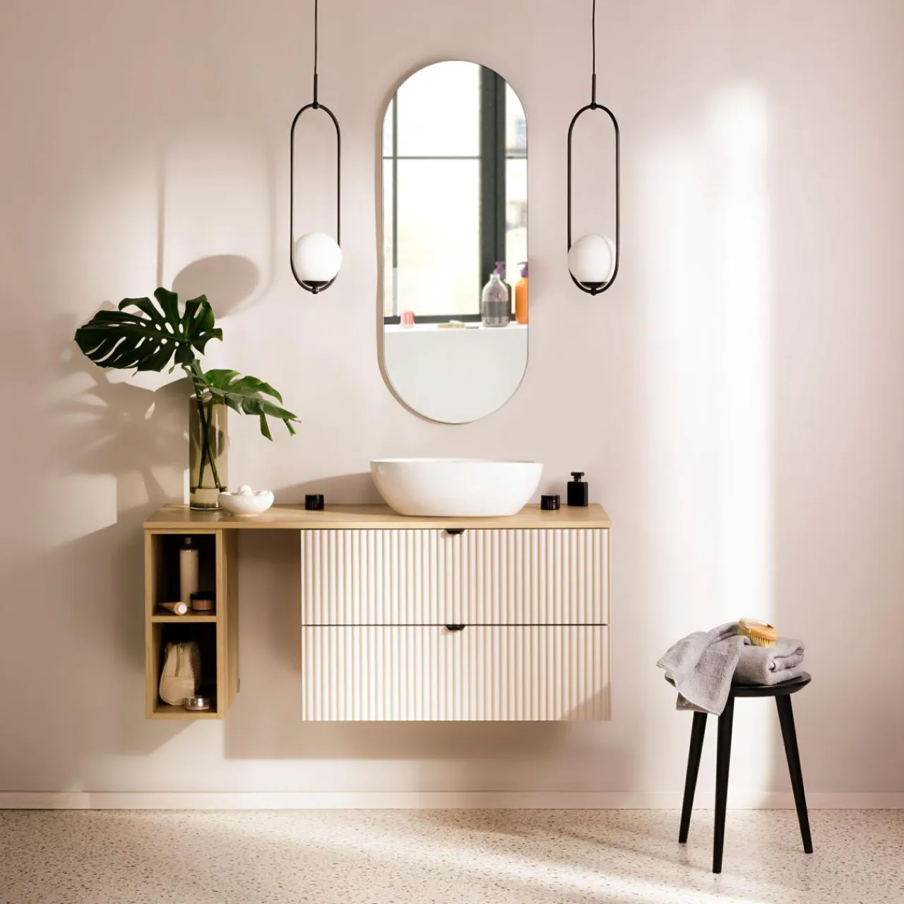 Z szafką umywalkową BELT nie zabraknie miejsca na akcesoria do łazienki. Suszarkę, żele pod prysznic i kosmetyki schowasz w 2 szufladach.