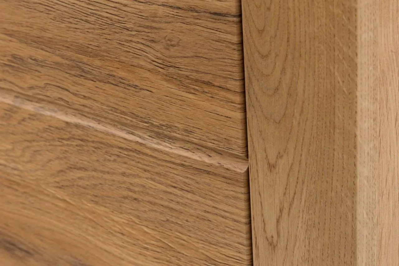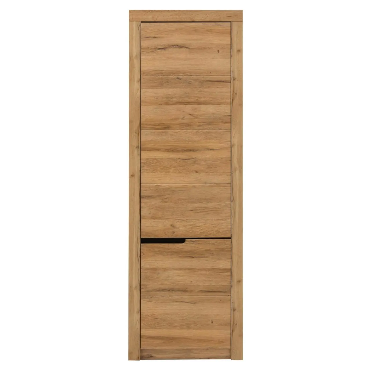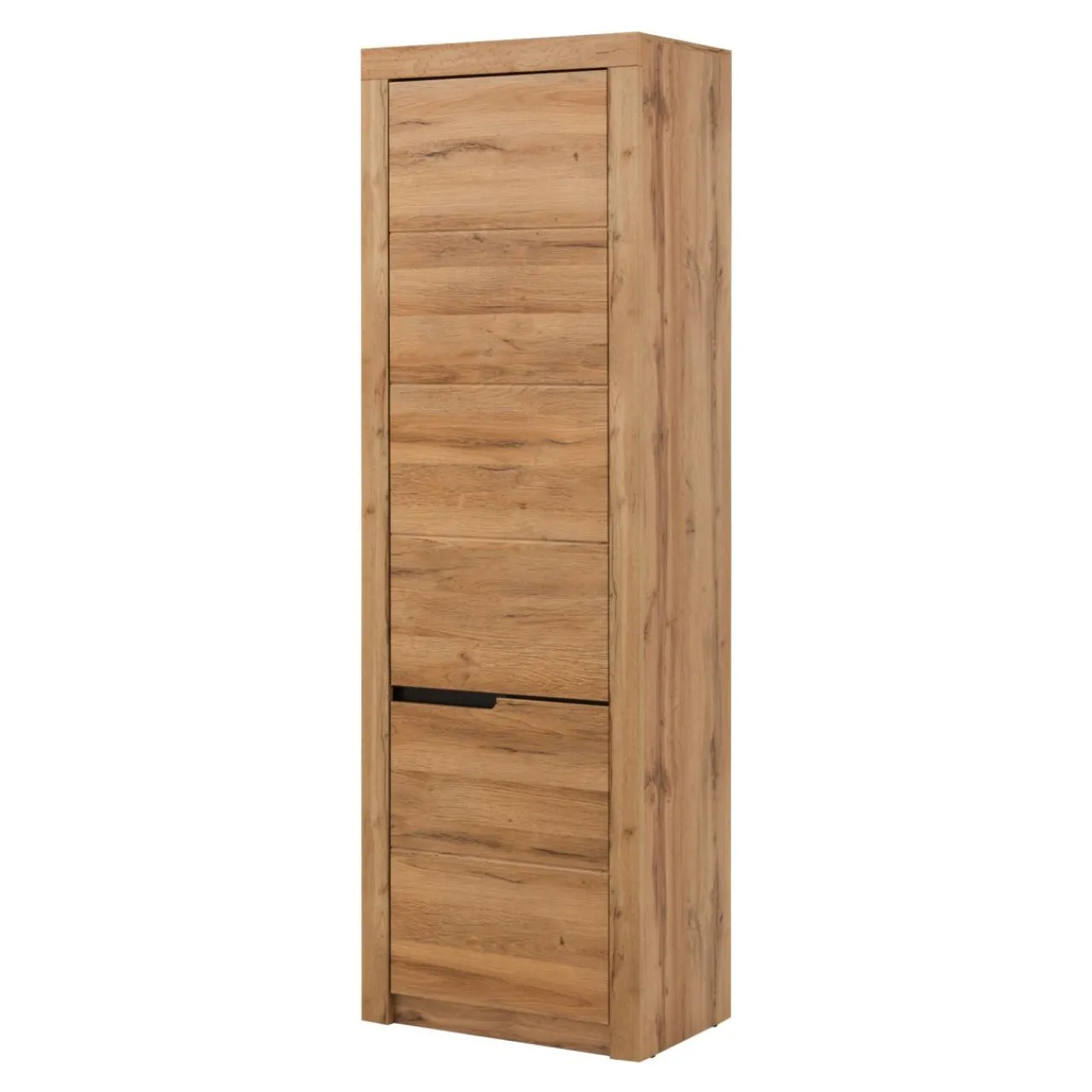 Korpus regału wykończono laminatem, imitującym strukturę drewna o ciepłej barwie „dębu wotan” (na tylnej ścianie – dąb złoty craft). Front pokryto folią PVC. Ciemny dekor współgra z nowoczesnymi elementami wykończenia.