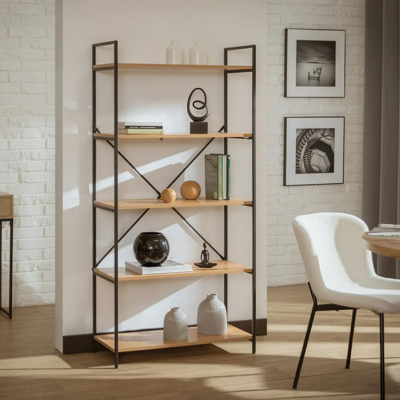 Połączenie odcienia jasnego drewna z czarnym metalowym stelażem sprawia, że mebel wpasuje się we wnętrza urządzone w stylu industrialnym.