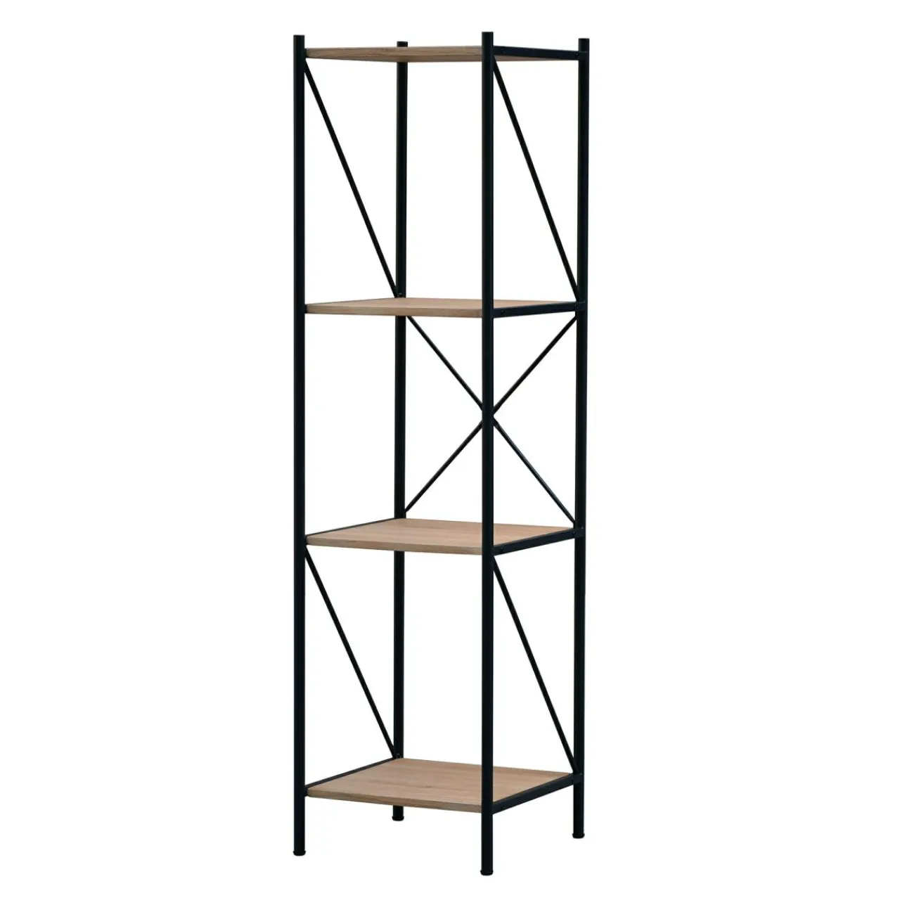 - Ciepłe wybarwienie półek połączone z metalowym korpusem będzie pasowało do industrialnych aranżacji.