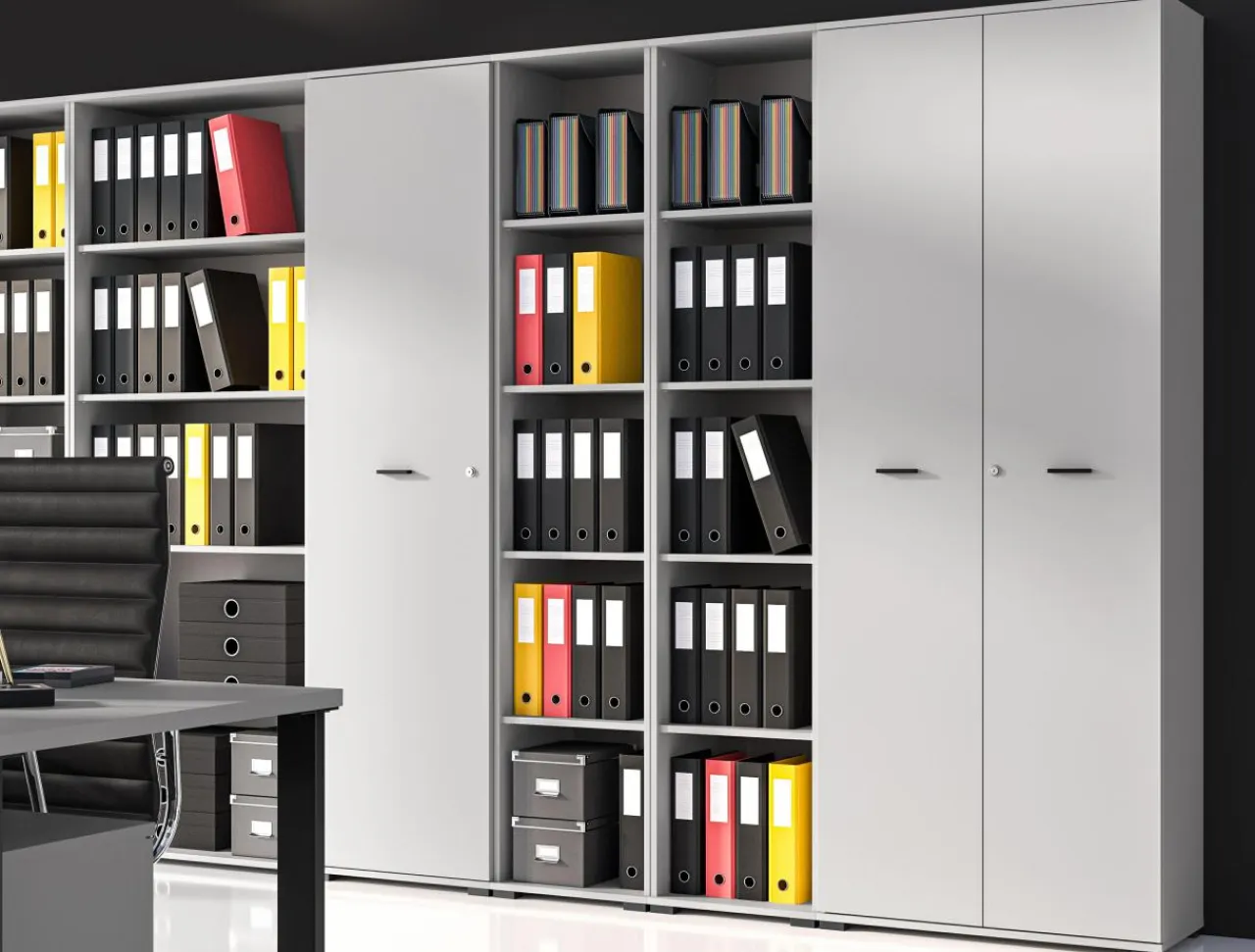 - Jasnoszare meble uzupełnią przestrzeń domowego gabinetu lub małej firmy.