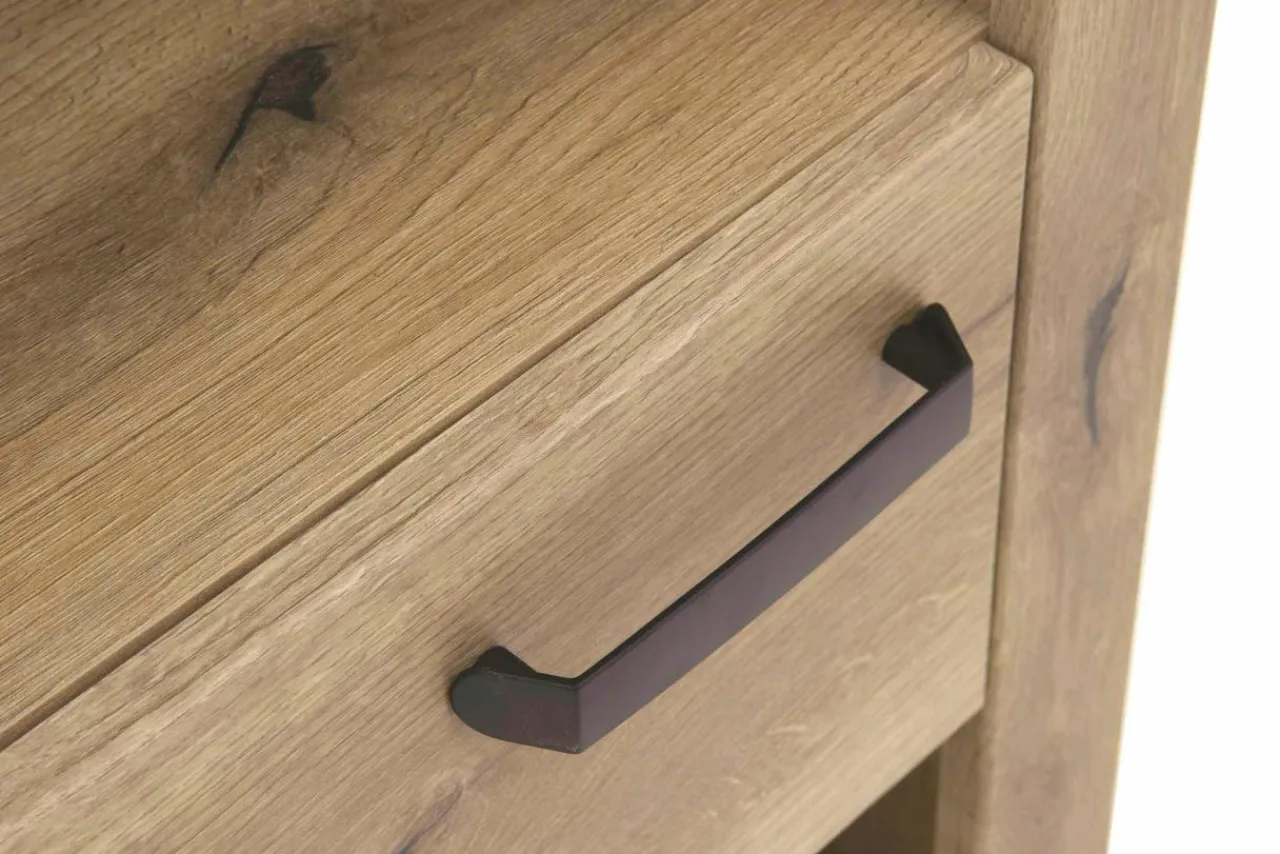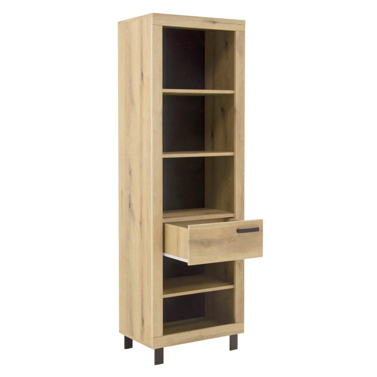- Regał jest wykończony laminatem imitującym naturalny dąb w odcieniu Coast Evoke.