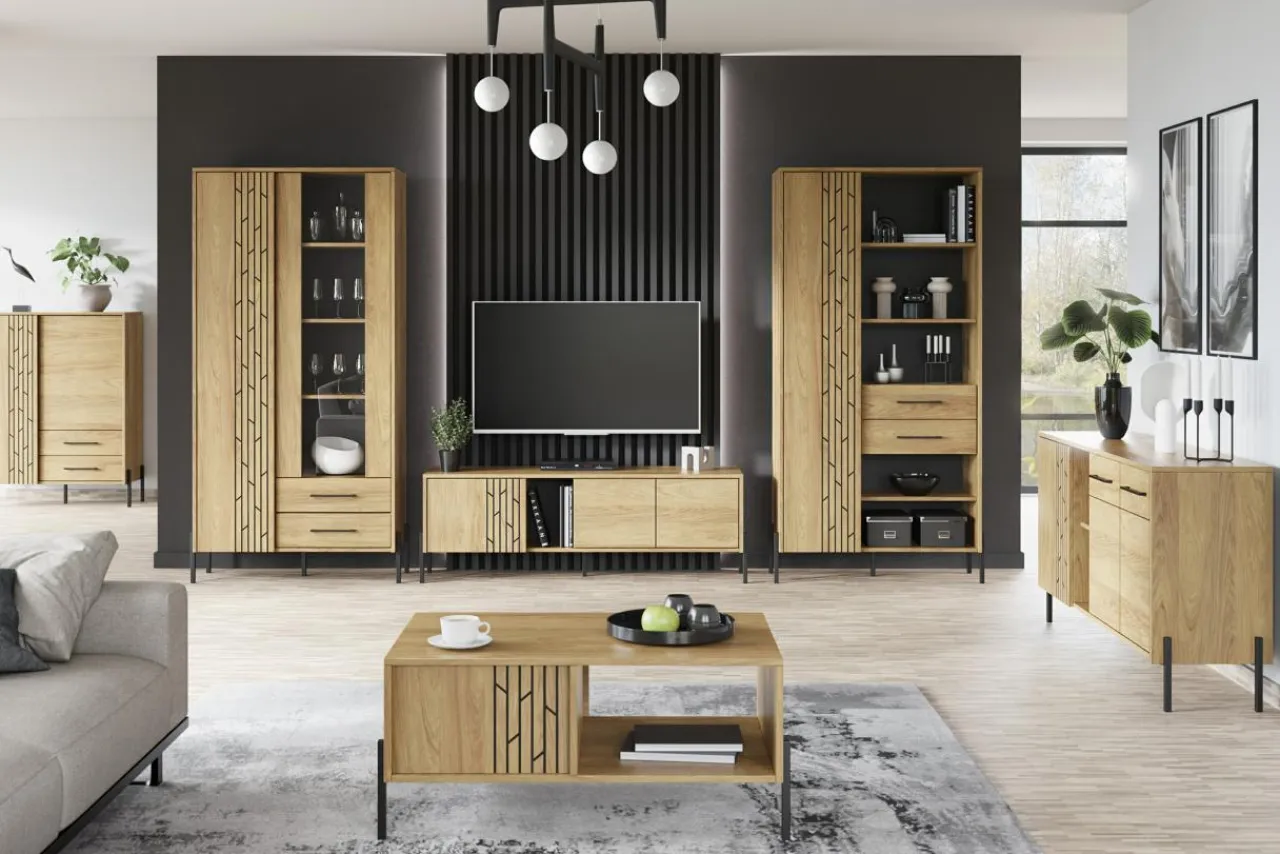 - Na meblach widoczny jest rysunek drewna, dzięki czemu prezentują się one naturalnie i elegancko.