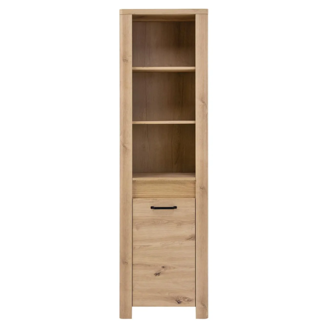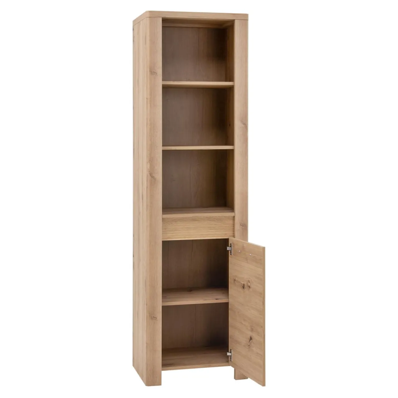 Regał MORIS posiada otwarte półki oraz zamykaną szafkę w dolnej części mebla.
