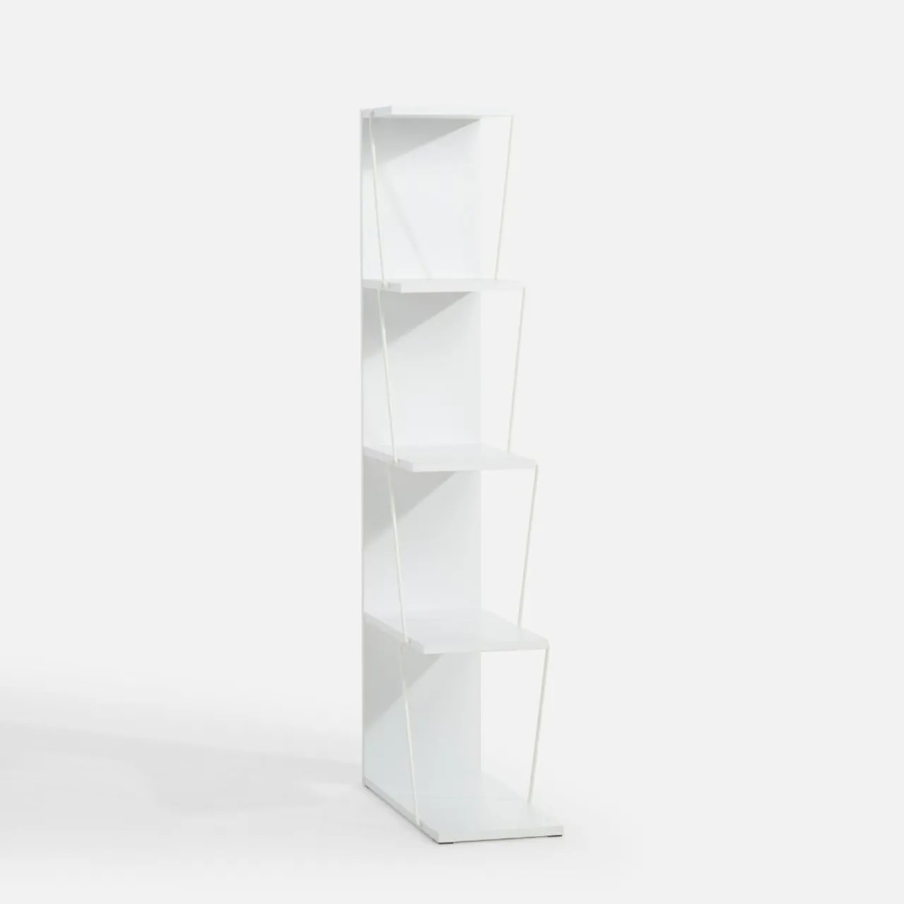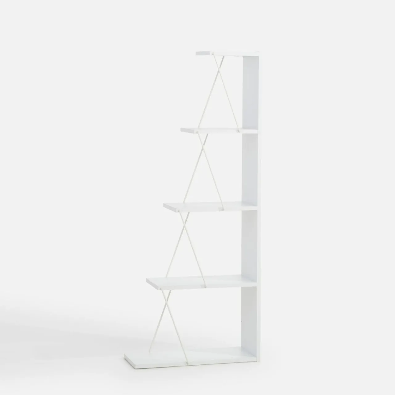 Biały regał LAMIGO o nietypowym designie idealnie pasuje do nowoczesnych wnętrz. Dzięki asymetrycznie ułożonym półkom, które wspierane są przez subtelne krzyżujące się podpory, regał wyróżnia się lekkim, futurystycznym stylem, jednocześnie oferując praktyczne możliwości przechowywania.
