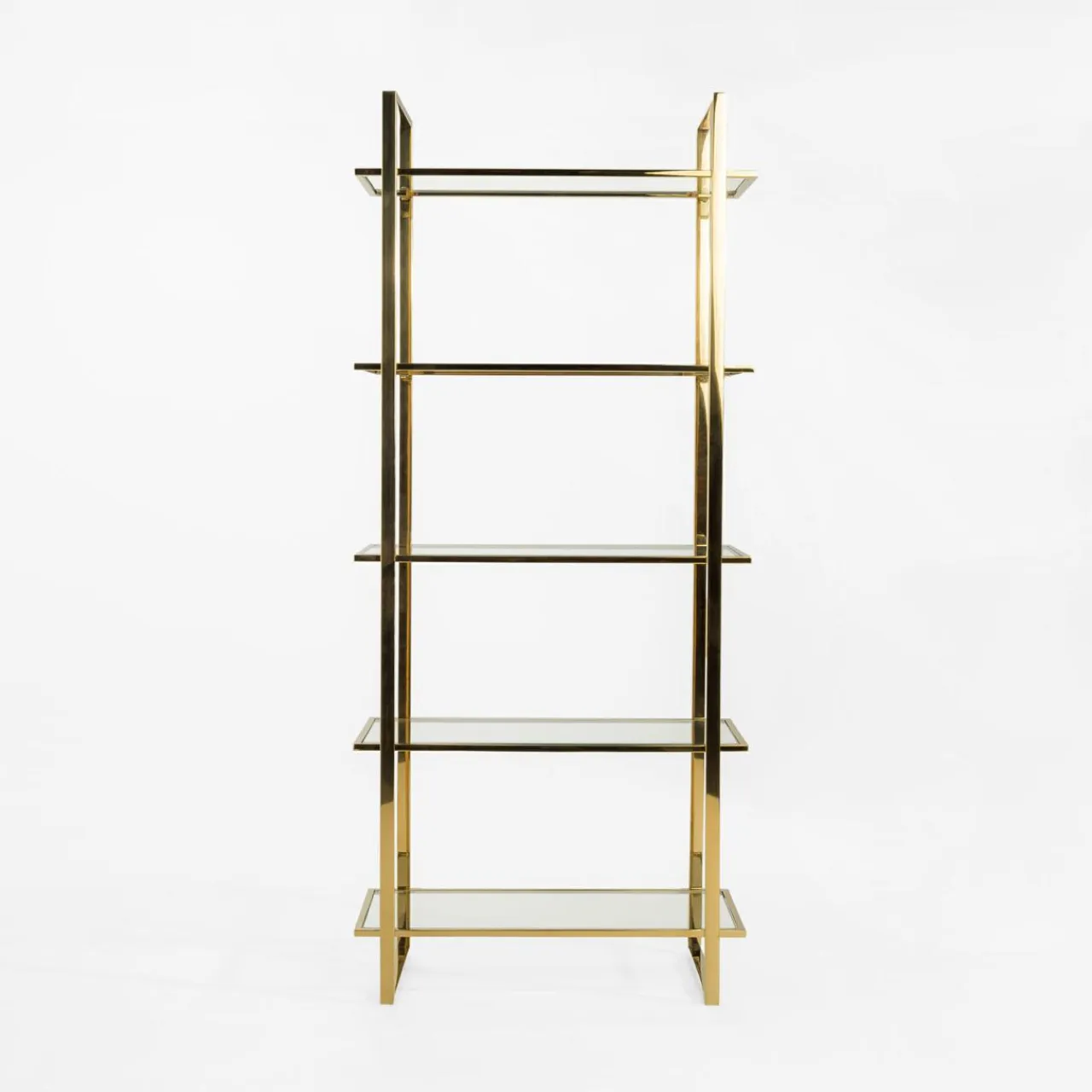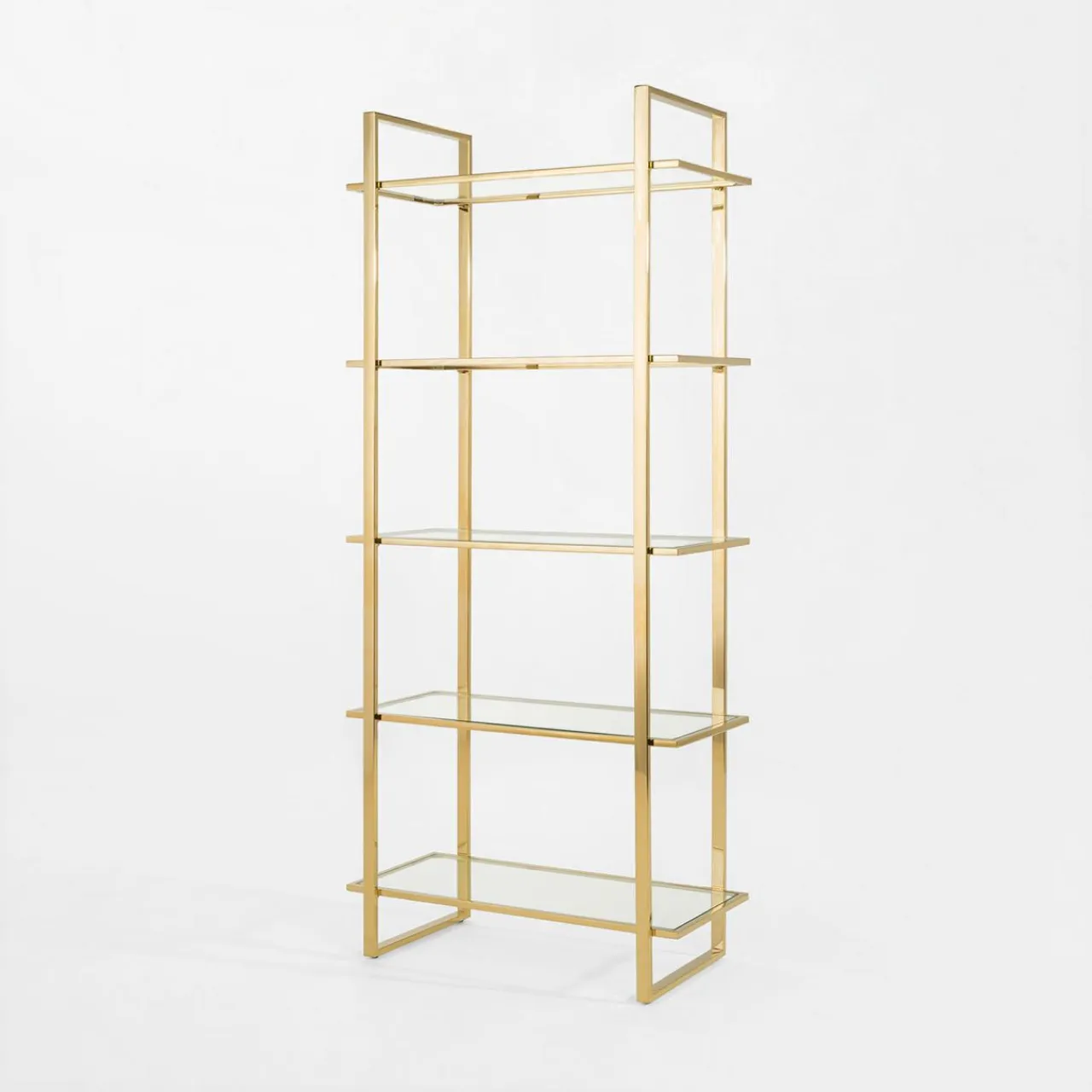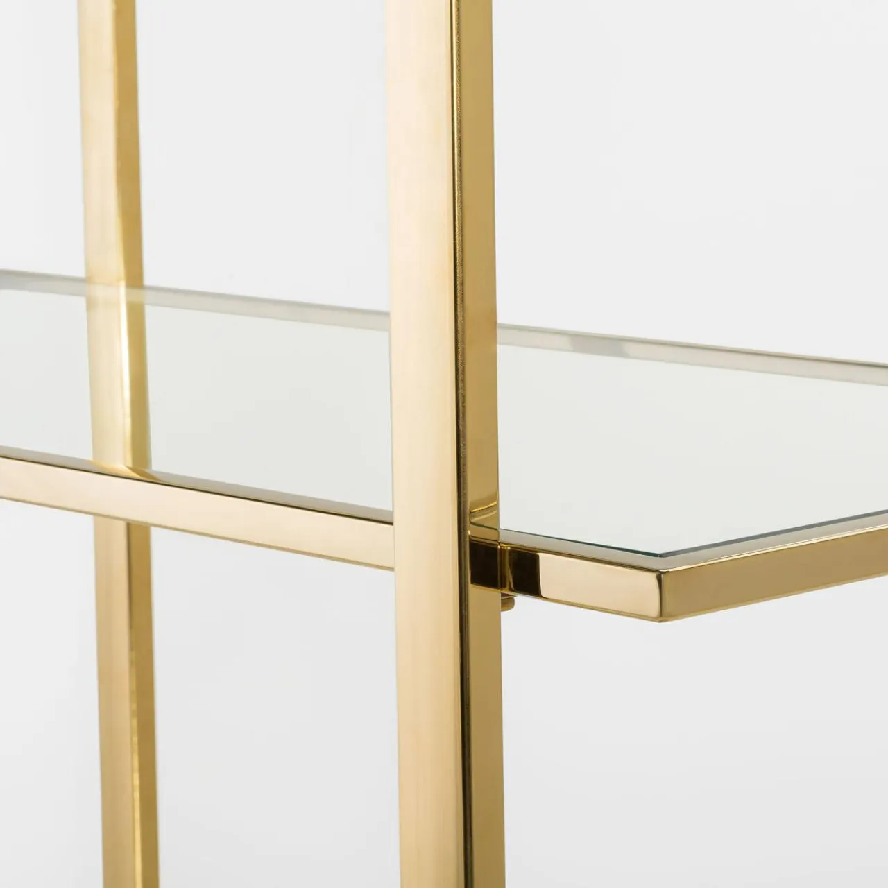 Z regałem EBRALIN stworzysz wymarzoną biblioteczkę w stylu glamour. Stelaż ze złotej stali nierdzewnej i szklane półki będą odpowiednim miejscem do ekspozycji swoich ulubionych książek.