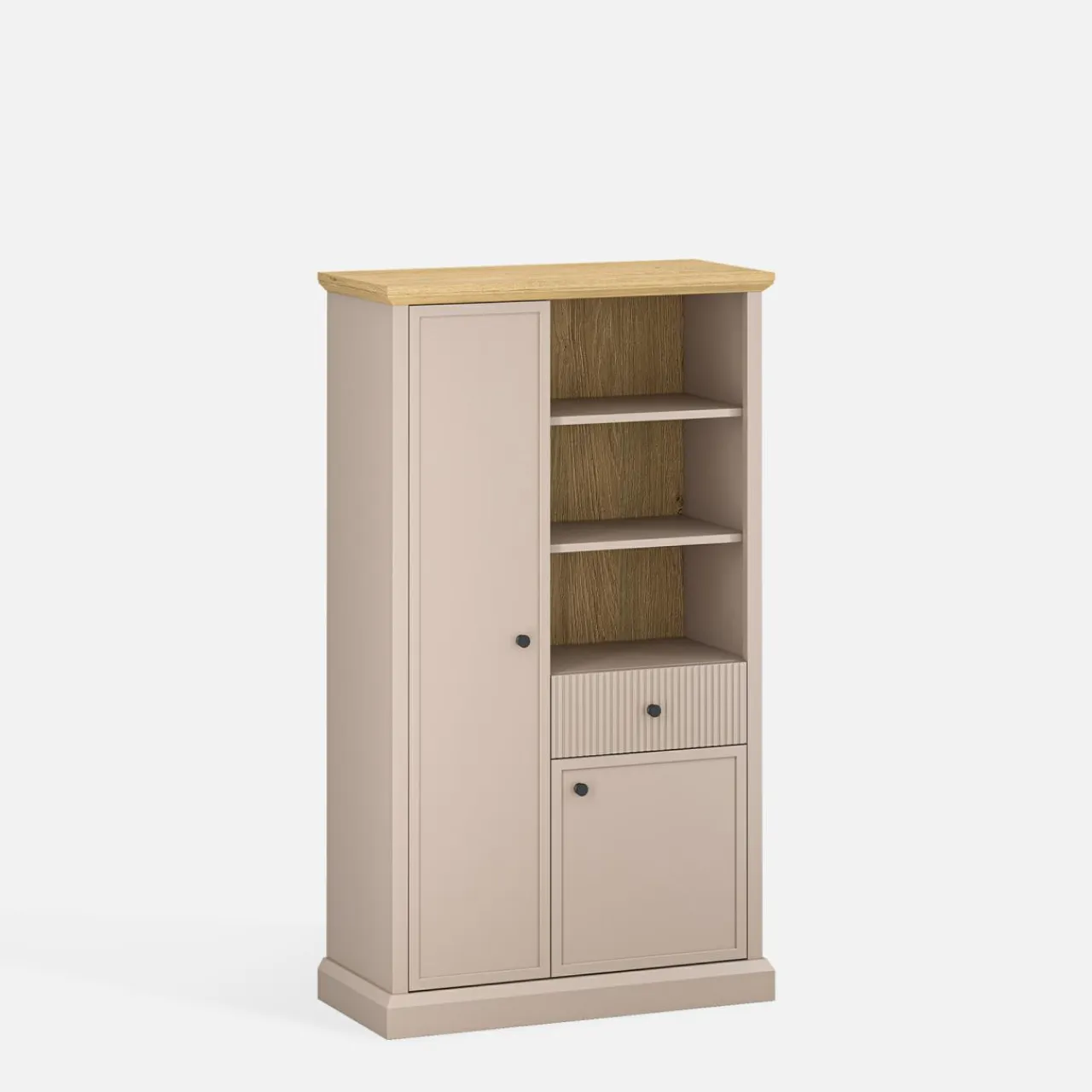 - Stylowy wygląd – połączenie odcienia taupe z dębem kamiennym nadaje regałowi nowoczesnego charakteru.