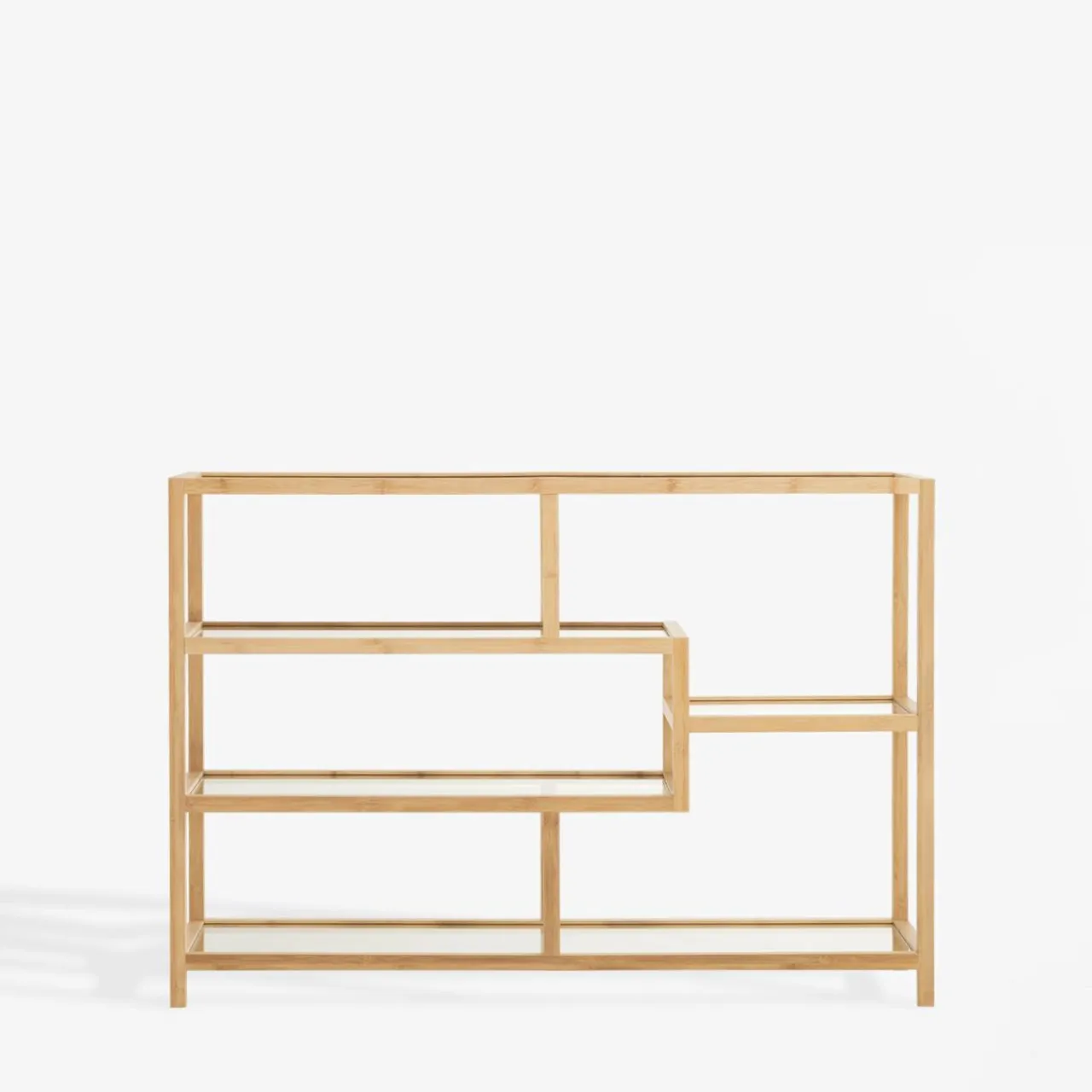 Regał HORO świetnie wpisze się w aranżacje w stylu boho lub minimalistycznym. Naturalne drewno bambusowe oraz przejrzystość szkła hartowanego sprawiają, że mebel prezentuje się lekko. Nieregularne ułożenie półek dodaje nowoczesnego charakteru.