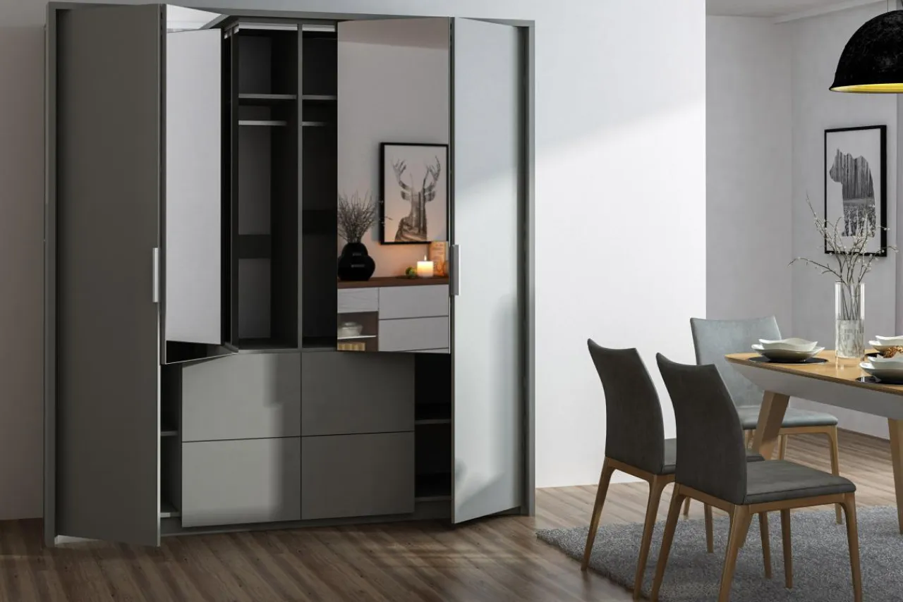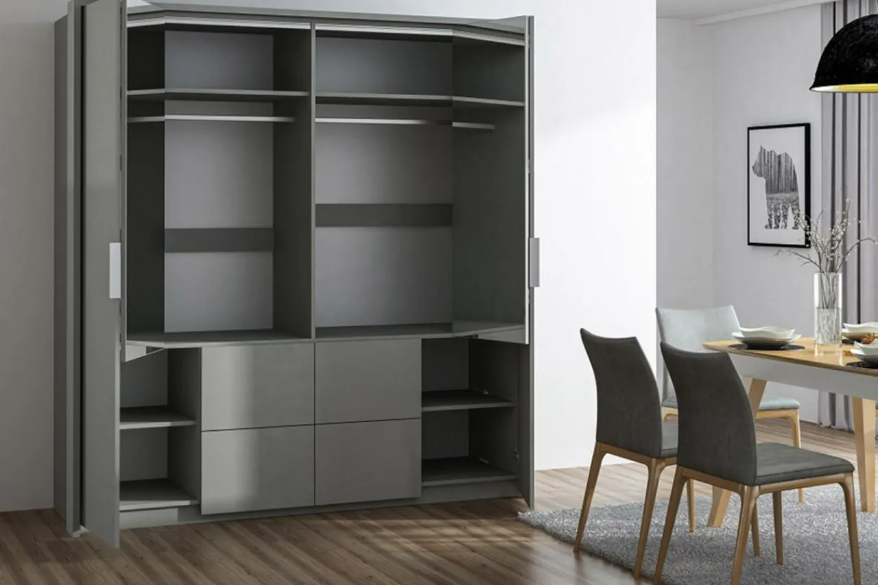 Szafa WIEDEŃ z łamanym frontem prowadzonym na prowadnicy kulkowej zapewni Ci odpowiednią ilość wnęk, a przy tym wygląda bardzo nowocześnie. Dzięki łamanemu frontowi, drzwi otwierają się łatwiej, a Ty możesz wygodnie sięgać po swoją garderobę nawet w małej przestrzeni.