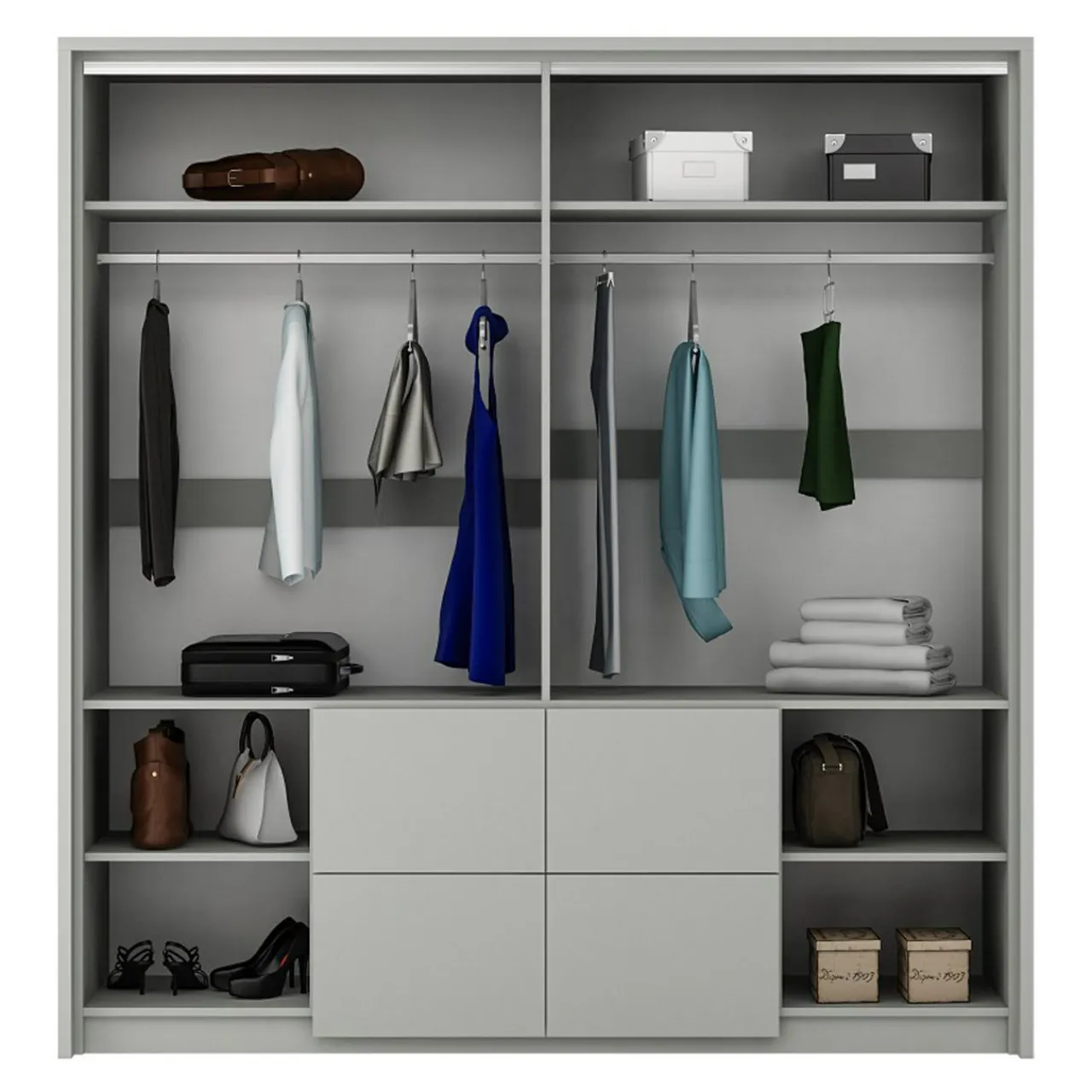 - 4 pojemne szuflady pomieszczą paski do spodni i okulary albo niewielkie części garderoby jak bielizna, skarpetki lub apaszki.