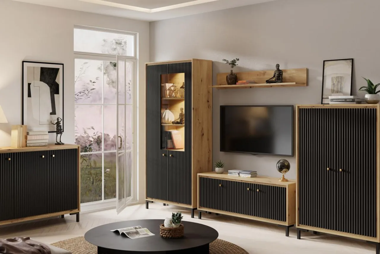 Fronty z ryflowaniem oraz korpus w wybarwieniu dąb artisan sprawiają, że meble wpasowują się w nowoczesne trendy.