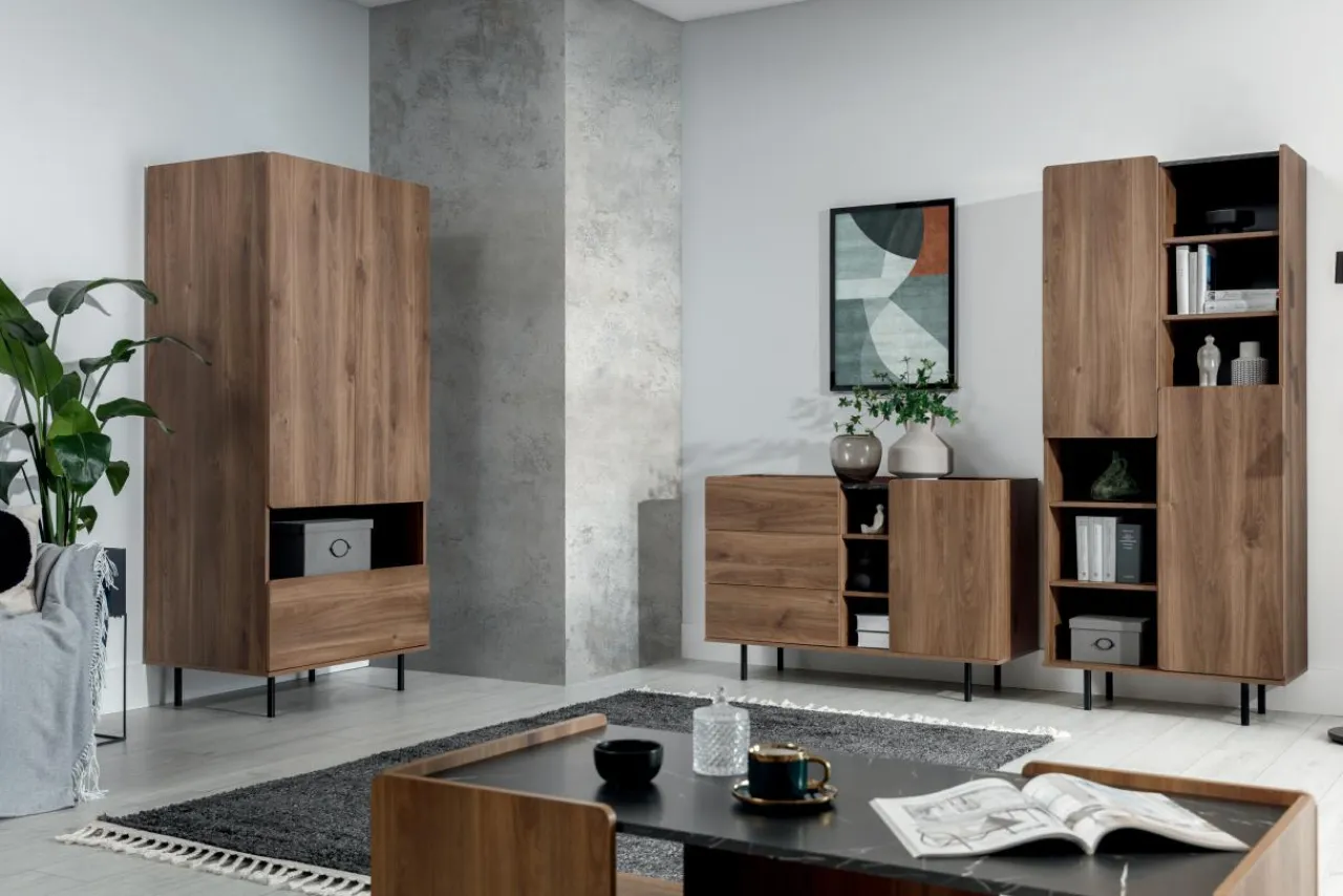 Kolekcja mebli CHIRO w kolorze dębu brandy castello, z widocznymi słojami drewna, wprowadza do wnętrza przytulny klimat. Ten elegancki odcień brązu świetnie zaprezentuje się we wnętrzach w stylu retro.