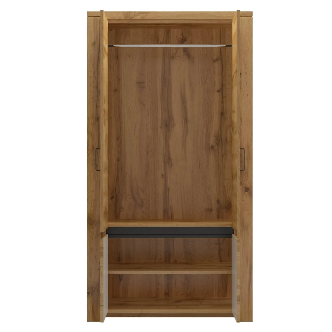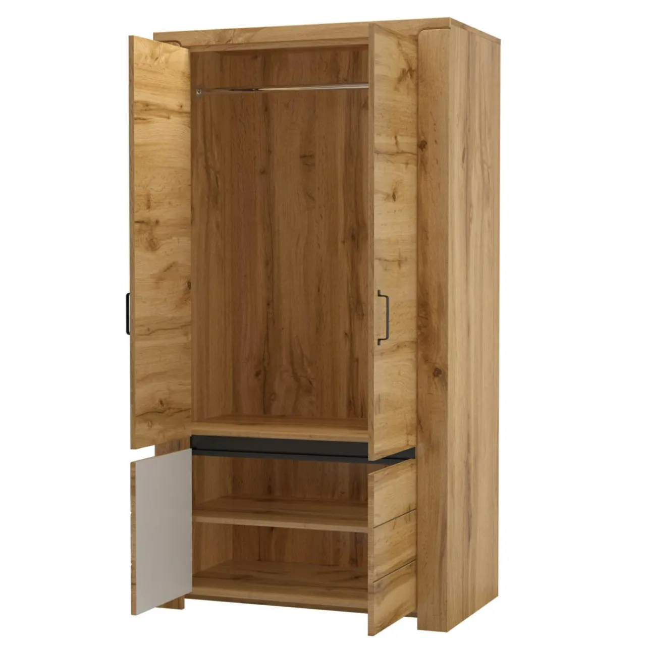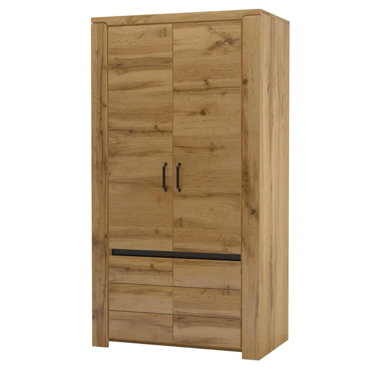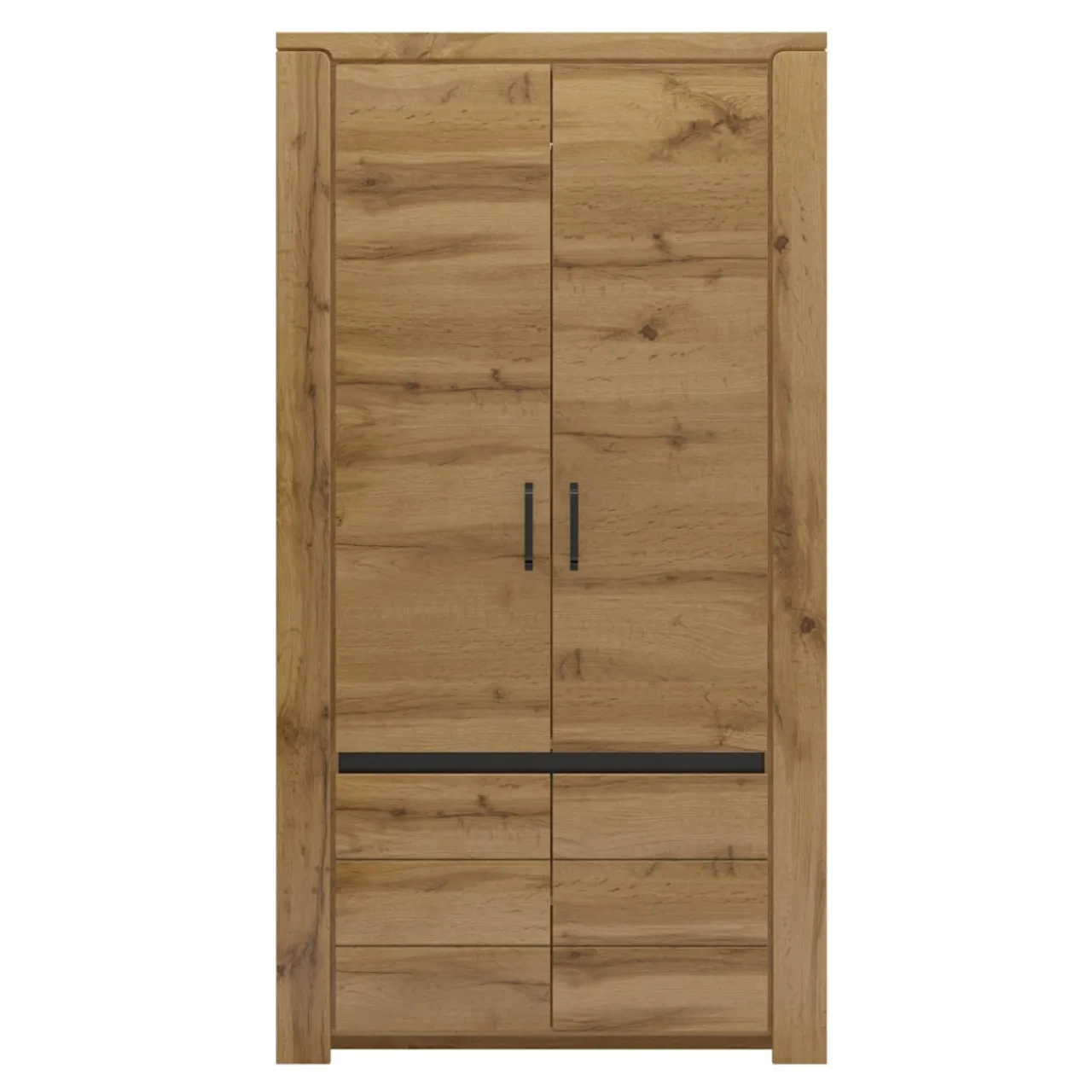 Metalowe uchwyty i ciemny dekor umożliwiają estetyczne wkomponowanie mebli w nowoczesne wnętrza. Wystrój dopełnią drewniane dekoracje lub dodatki w czarnym kolorze.