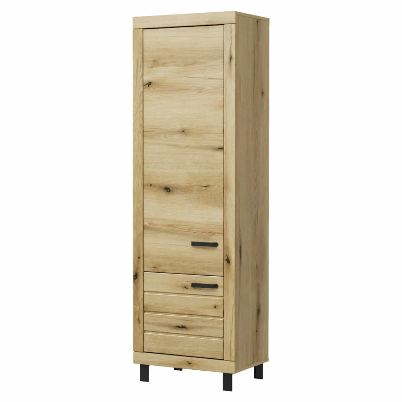 - Szafa jest wykończona laminatem oraz folią, imitującymi naturalny dąb w odcieniu Coast Evoke;