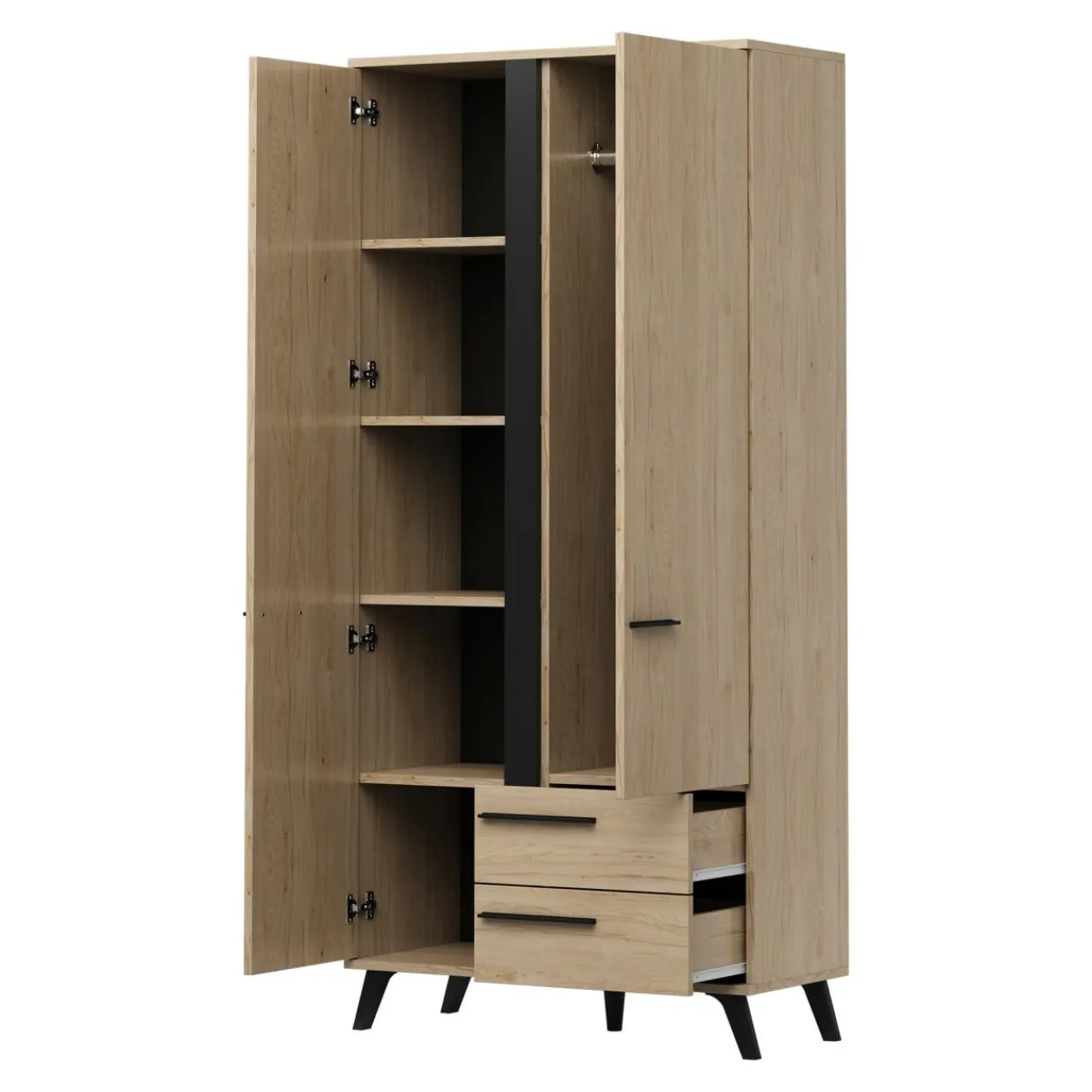 Wnętrze szafy kryje praktyczne 5 wnęk, przedzielonych 4 półkami. Są idealne do przechowywania drobniejszych elementów garderoby lub wszelkich pudeł czy organizerów, które pomagają w utrzymaniu przedmiotów w ładzie. Część szafy zajmuje duża wnęka z drążkiem do zawieszenia ubrań na wieszakach.