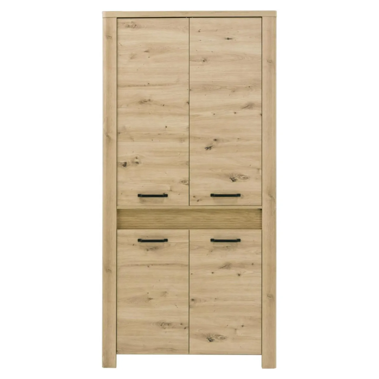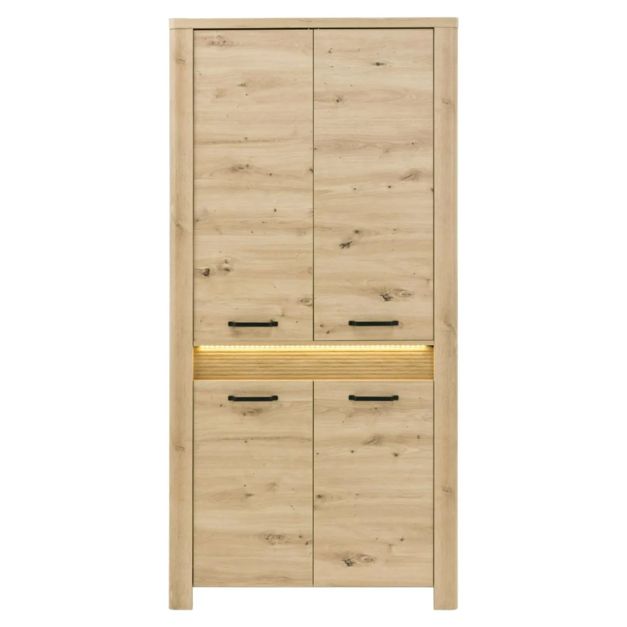 Szafa MORIS została wykonana z płyty meblowej, wykończonej laminatem..Posiada oświetlenie LED umieszczone przy ozdobnej części w połowie wysokości mebla.