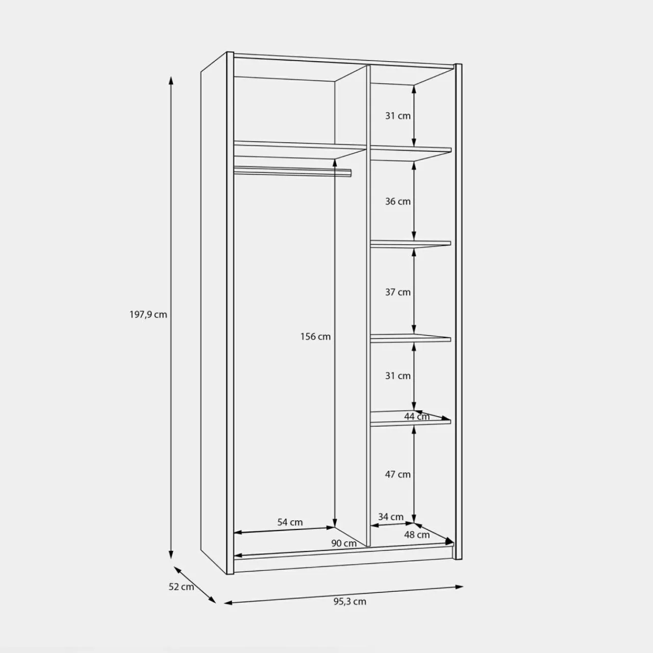 Stwórz dobre pierwsze wrażenie w przedpokoju z szafą OAK SQUERE. Szafa ma tylko 95,3 cm szerokości a zapewnia miejsce na ubrania w 6 wnękach oraz na drążku.