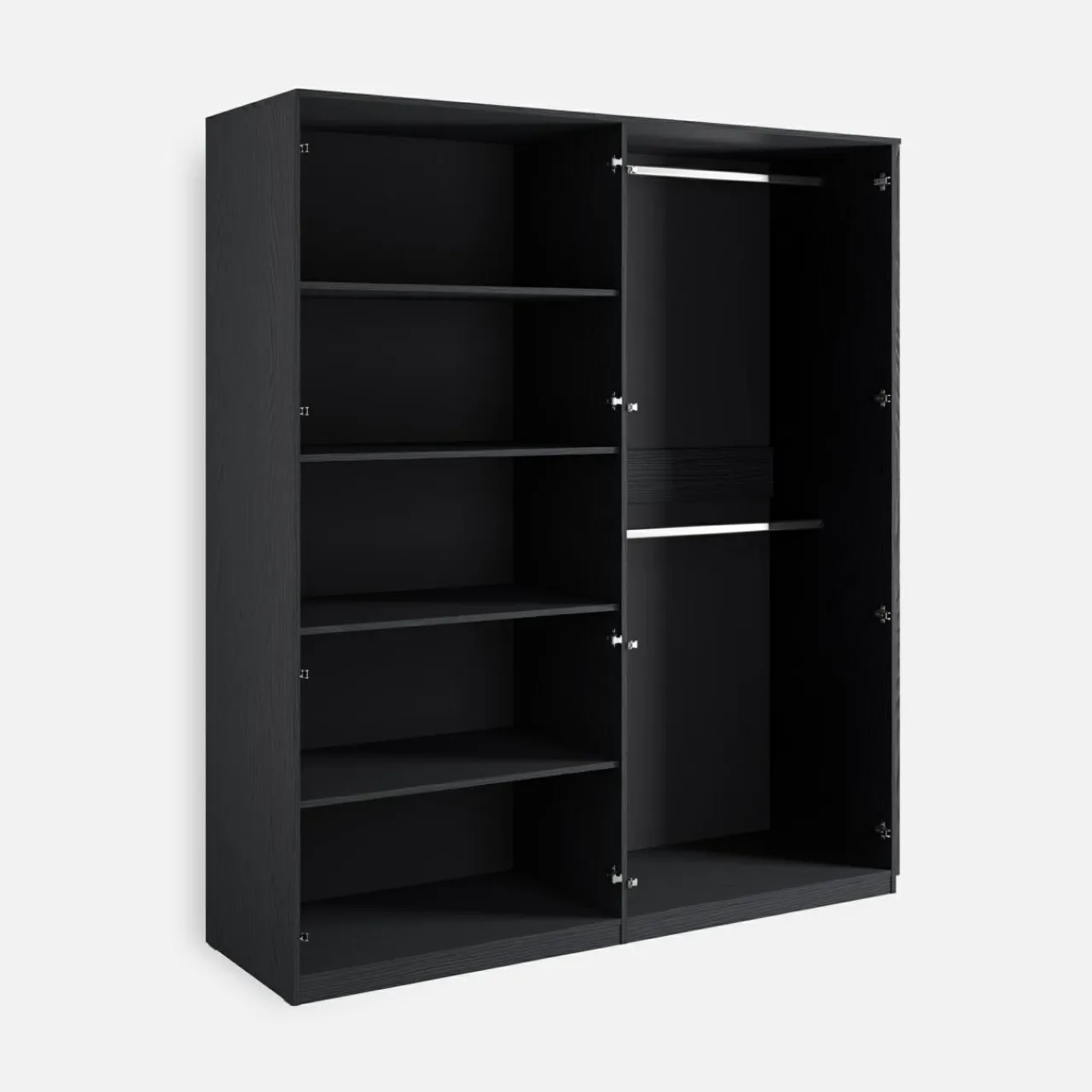 Szafa MOND sprawdzi się w sypialni dla dwojga — 2 drążki na ubrania ułatwią rozdzielenie eleganckiej garderoby i kurtek, a półki pozwolą na poukładanie reszty ubrań.