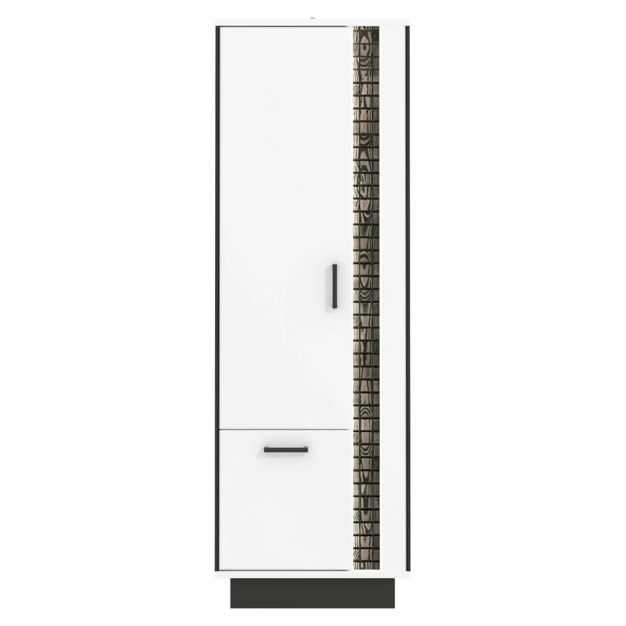 - Korpus mebla oraz półki są wykonane z połączenia płyty wiórowej o grubości 16 mm i drewna sosnowego o grubości 20 mm. Są wykończone matowym laminatem w klasycznej bieli przełamanej czarnymi wstawkami kolorystycznymi oraz wyjątkowo zdobnym dekorem;
