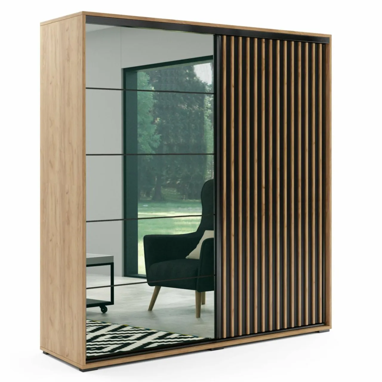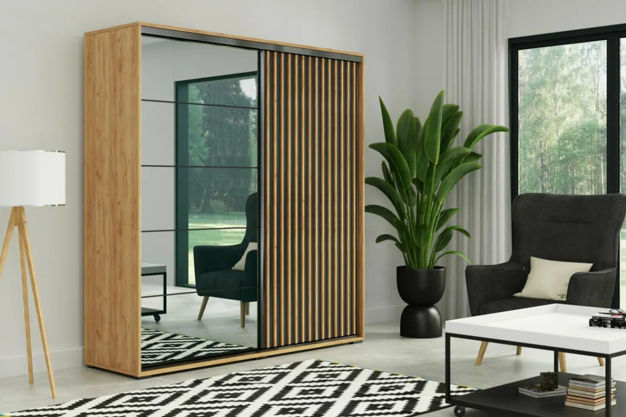 Szafa przesuwna z lamelami i lustrem LIMA pomoże zorganizować zarówno wieszaki z sukienkami, koszulami czy płaszczami, jak i poskładane ubrania.
