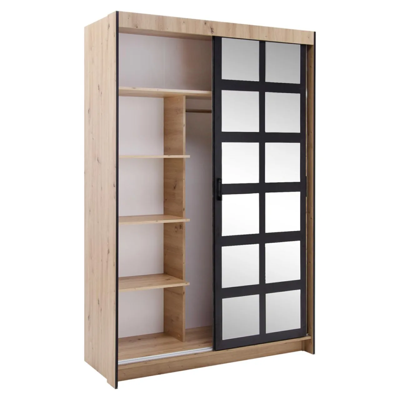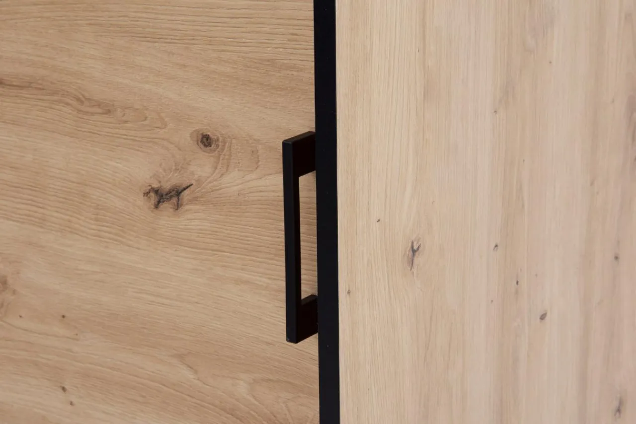 - Dzięki połączeniu laminatu w kolorze jasnego dębu artisan oraz czarnej ramki – Twoja sypialnia nabierze nowoczesnego wyglądu.