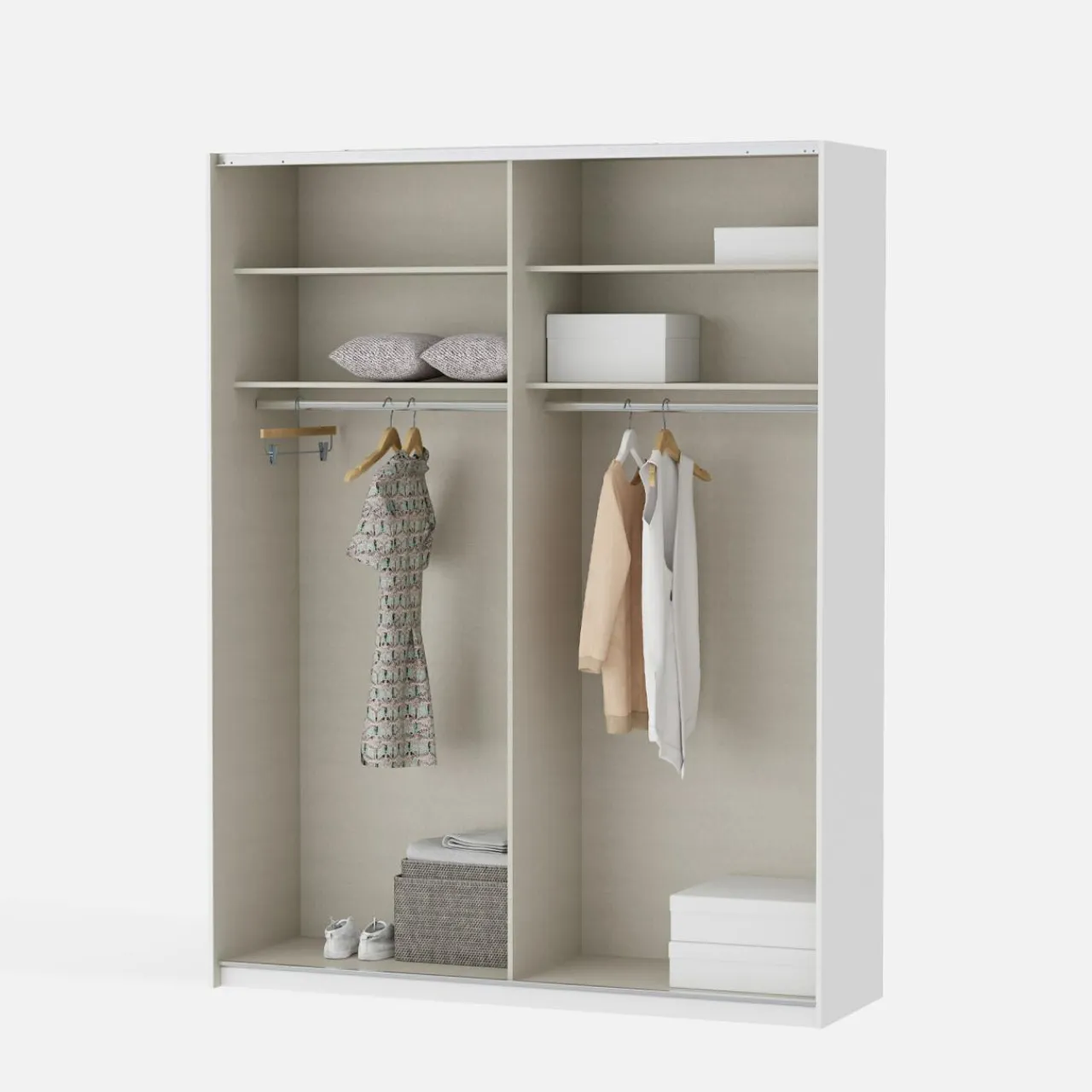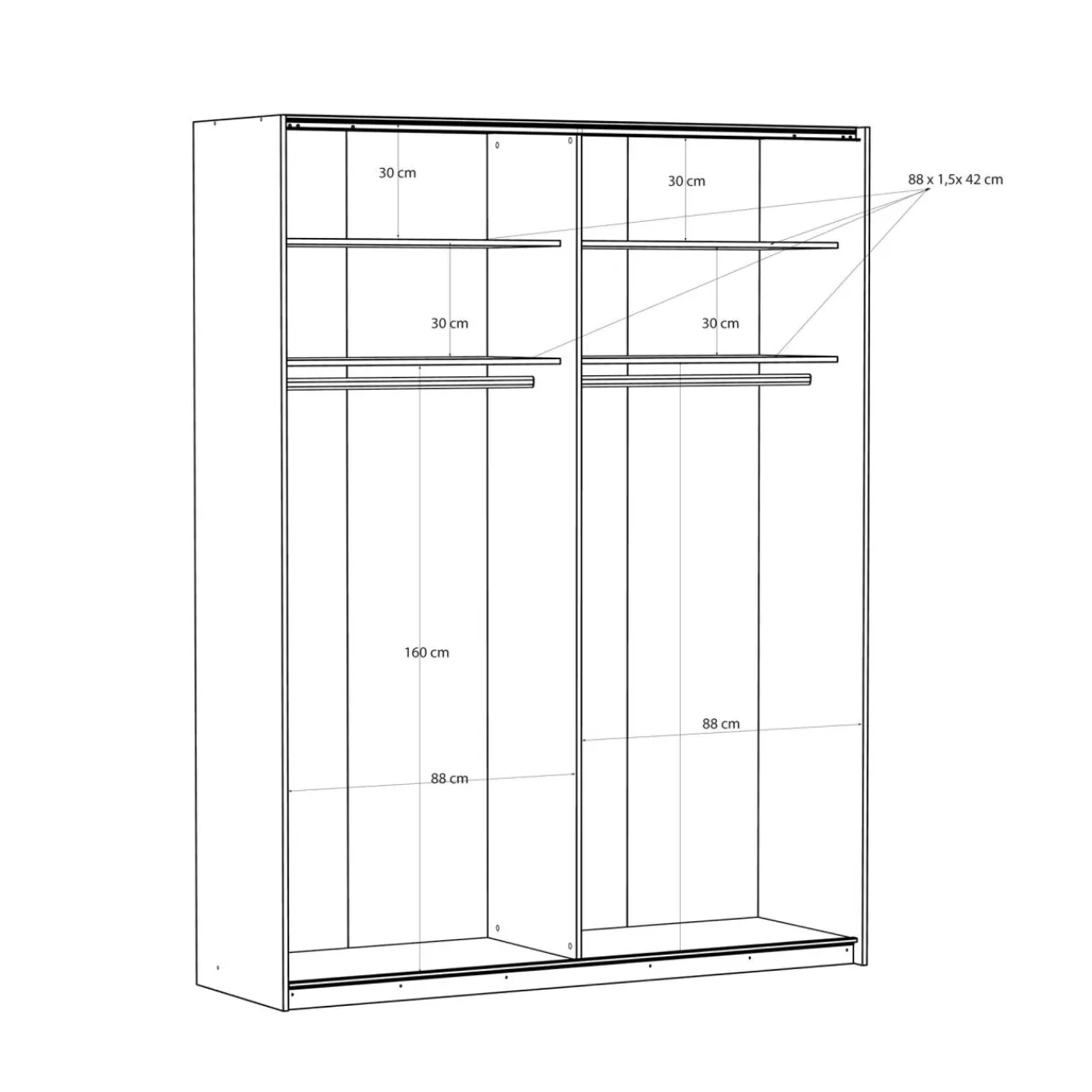 - Podzielona na dwie części — równomierne ułożenie półek i drążków w szafie umożliwia podzielenie wnętrza na różne sposoby; osobna część dla Ciebie i partnera lub dwójki rodzeństwa.