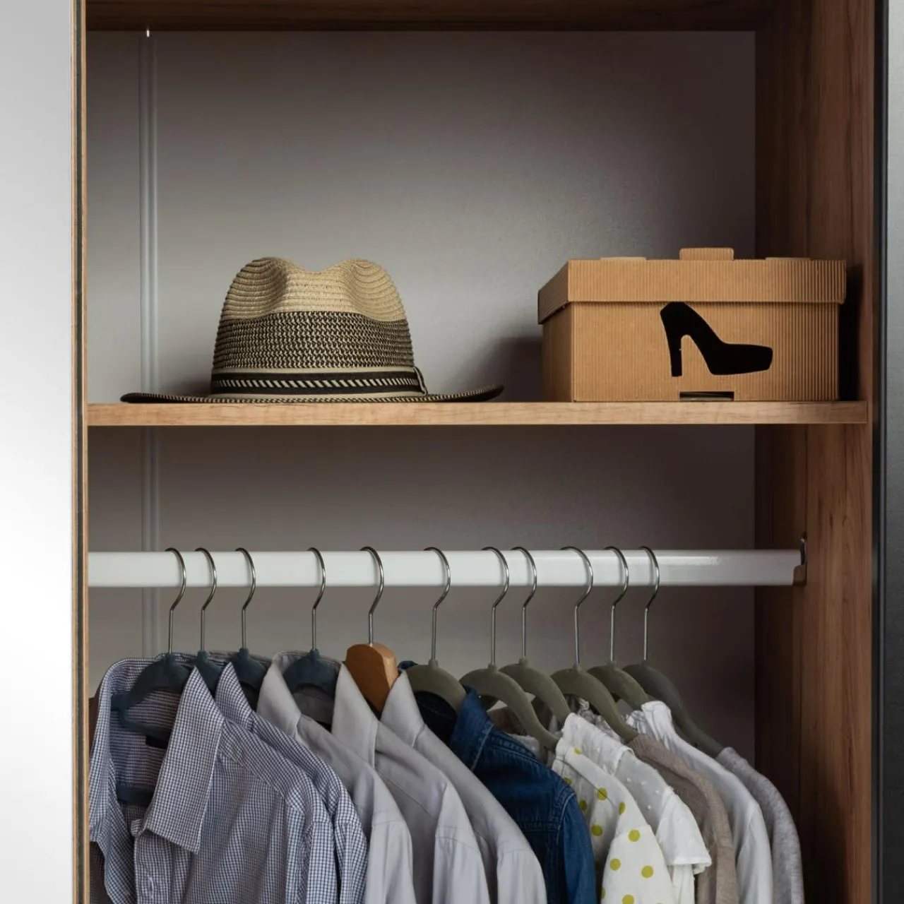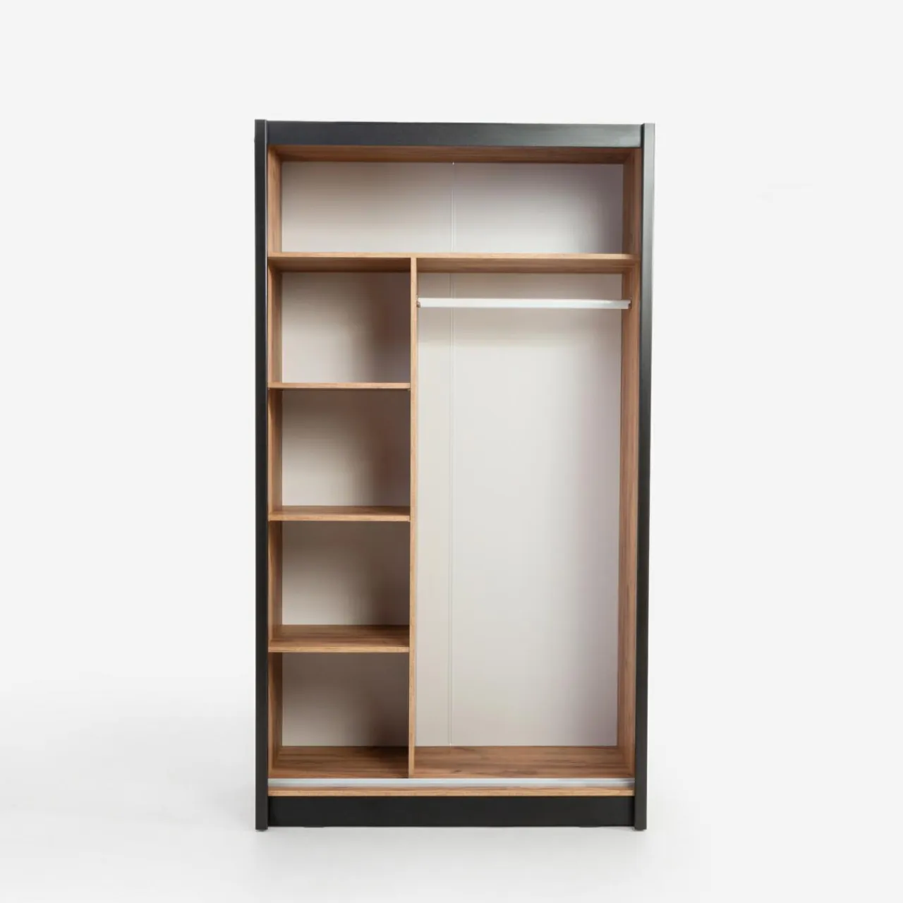 - Świetnie skomponowane wnętrze — oddzielone od siebie wnęki i część z drążkiem umożliwiają przechowywanie zarówno złożonych ubrań i dodatków, jak i zawieszenia na wieszakach.