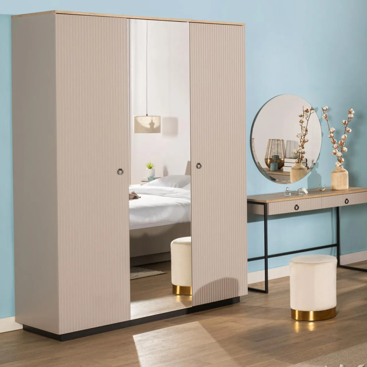 - Ryflowane fronty w kolorze taupe idealnie zgrywają się z korpusami. Wykończone są laminatem i folią.