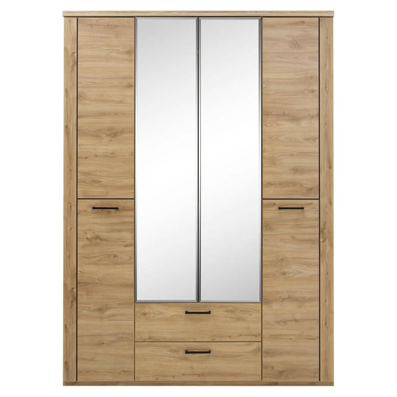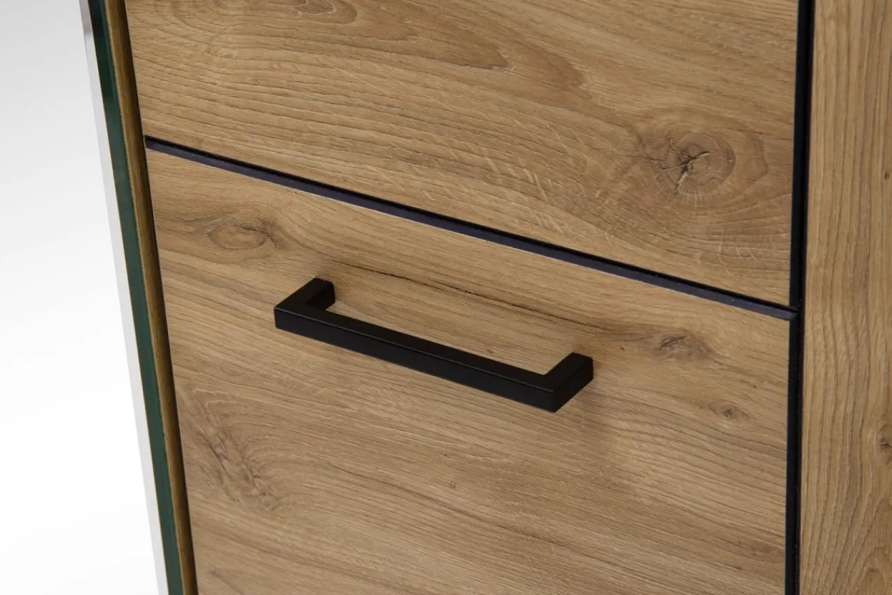 Szafa wykonana jest z laminowanej płyty w kolorze jasnego drewna. Delikatne zdobienia imitujące drewno oraz proste czarne uchwyty sprawiają, że szafa świetnie wkomponuje się we wnętrza urządzone w stylu rustykalnym lub nowoczesnym.