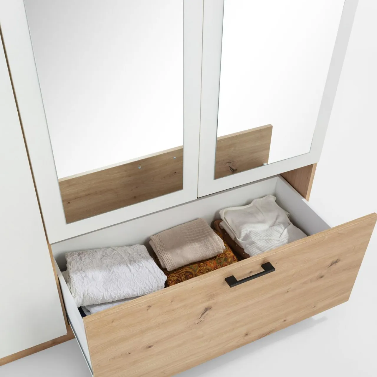 Szafa MILA oferuje mnóstwo miejsca na przechowywanie bez zajmowania nadmiaru przestrzeni. Nowoczesne połączenie bieli z dębem artisan wpasuje się zarówno w nowoczesny, jak i skandynawski styl, nadając przestrzeni świeżości i stylu.