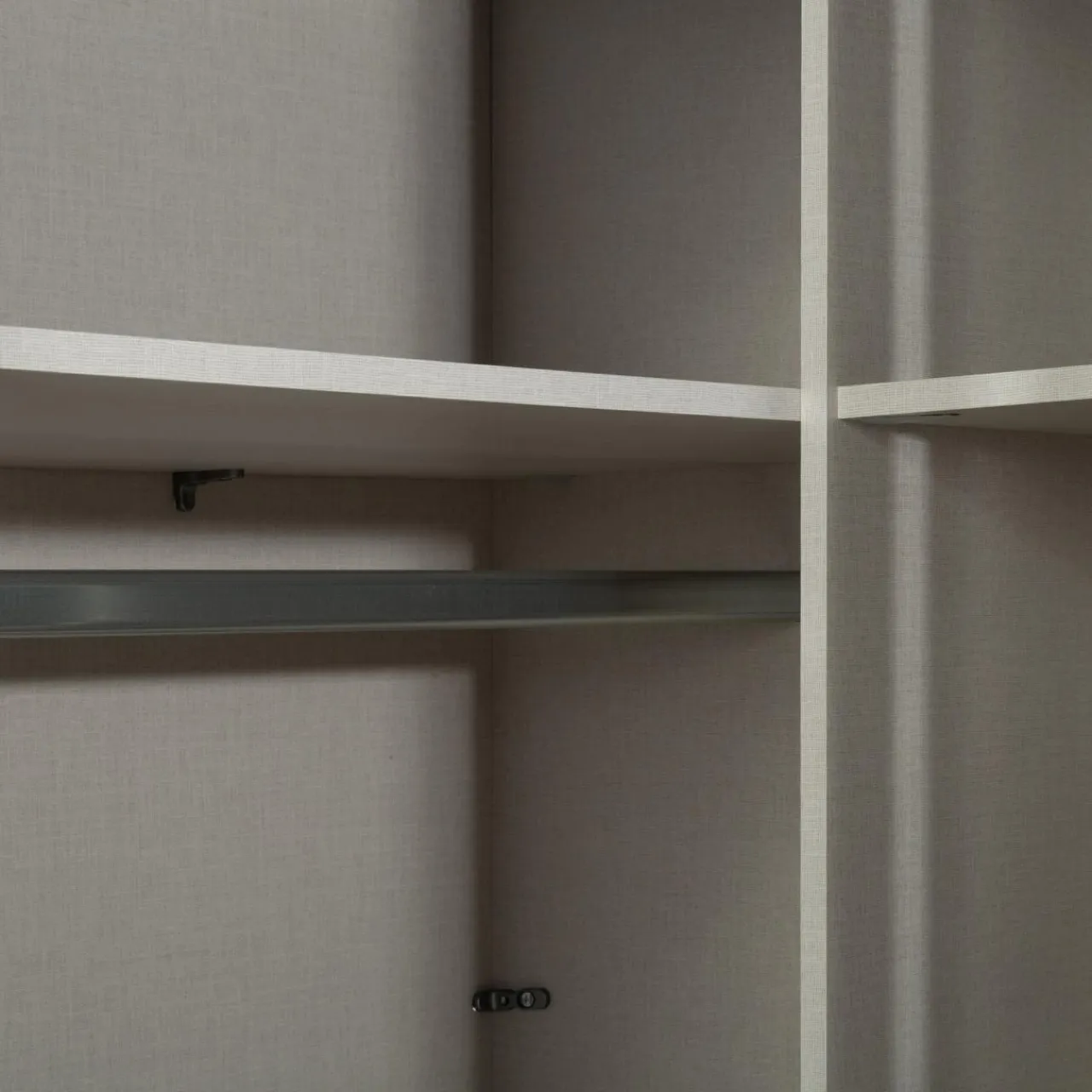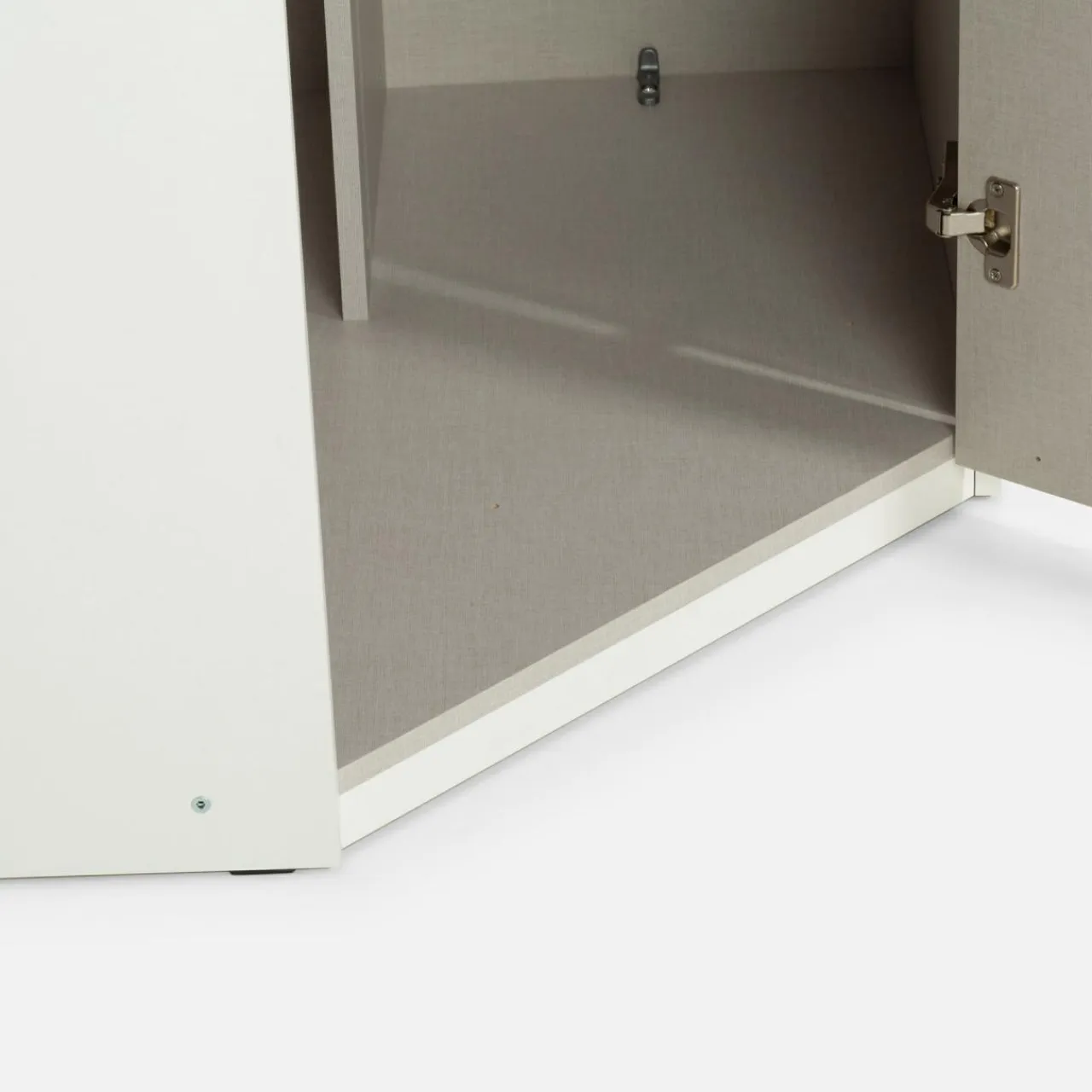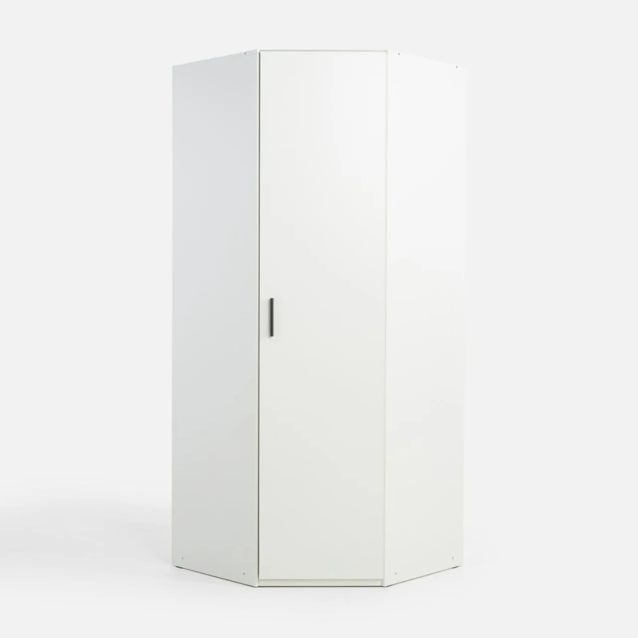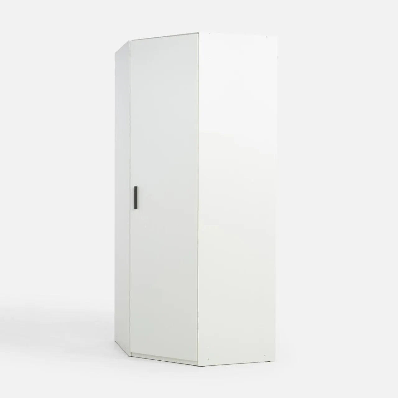 Szafa narożna TRAWEN zabuduje róg pomieszczenia, maksymalnie wykorzystując przestrzeń. W środku znajdują się półki i drążek na ubrania, dzięki którym każda część garderoby będzie miała swoje miejsce.