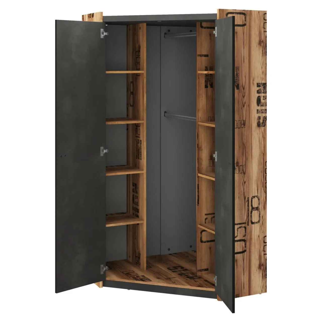 Fronty przypominające strukturą beton zostały zestawione z korpusami wykończonymi okleiną w ciepłym dekorze drewna zdobionej dekoracyjnym nadrukiem. Takie połączenie tworzy harmonijny duet podkreślając jednocześnie nieszablonowy charakter mebla.