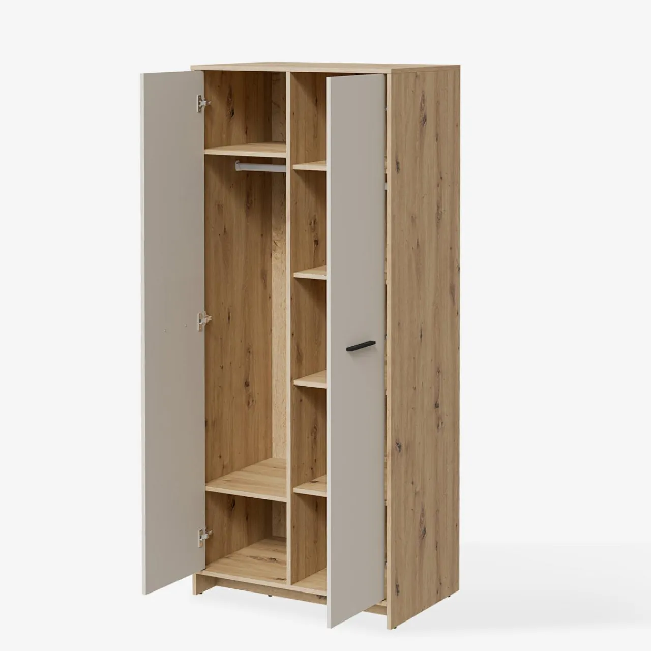 - Porządek wisi w powietrzu dzięki 2 drążkom na wieszaki – umieścisz na nich okrycia wierzchnie czy koszule.