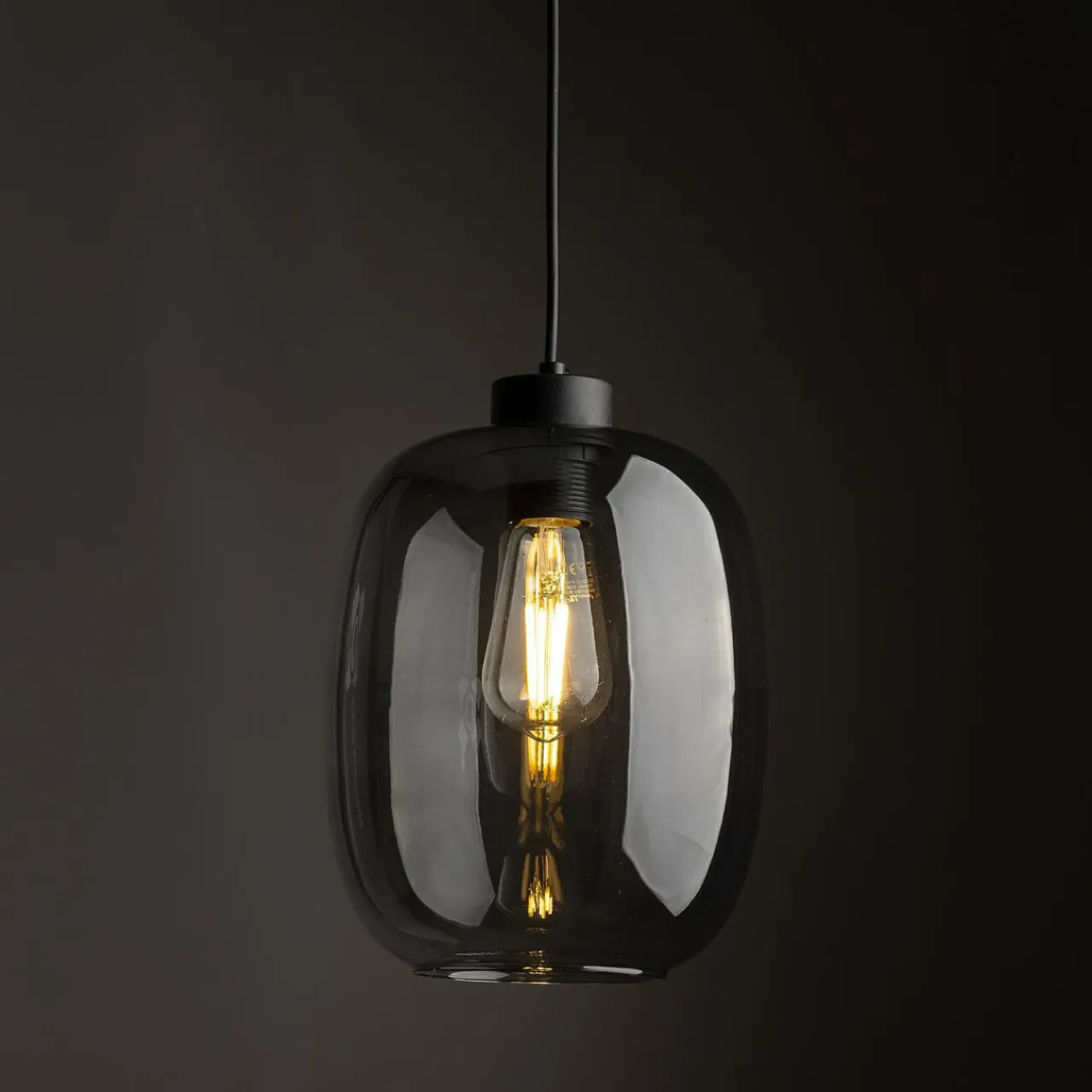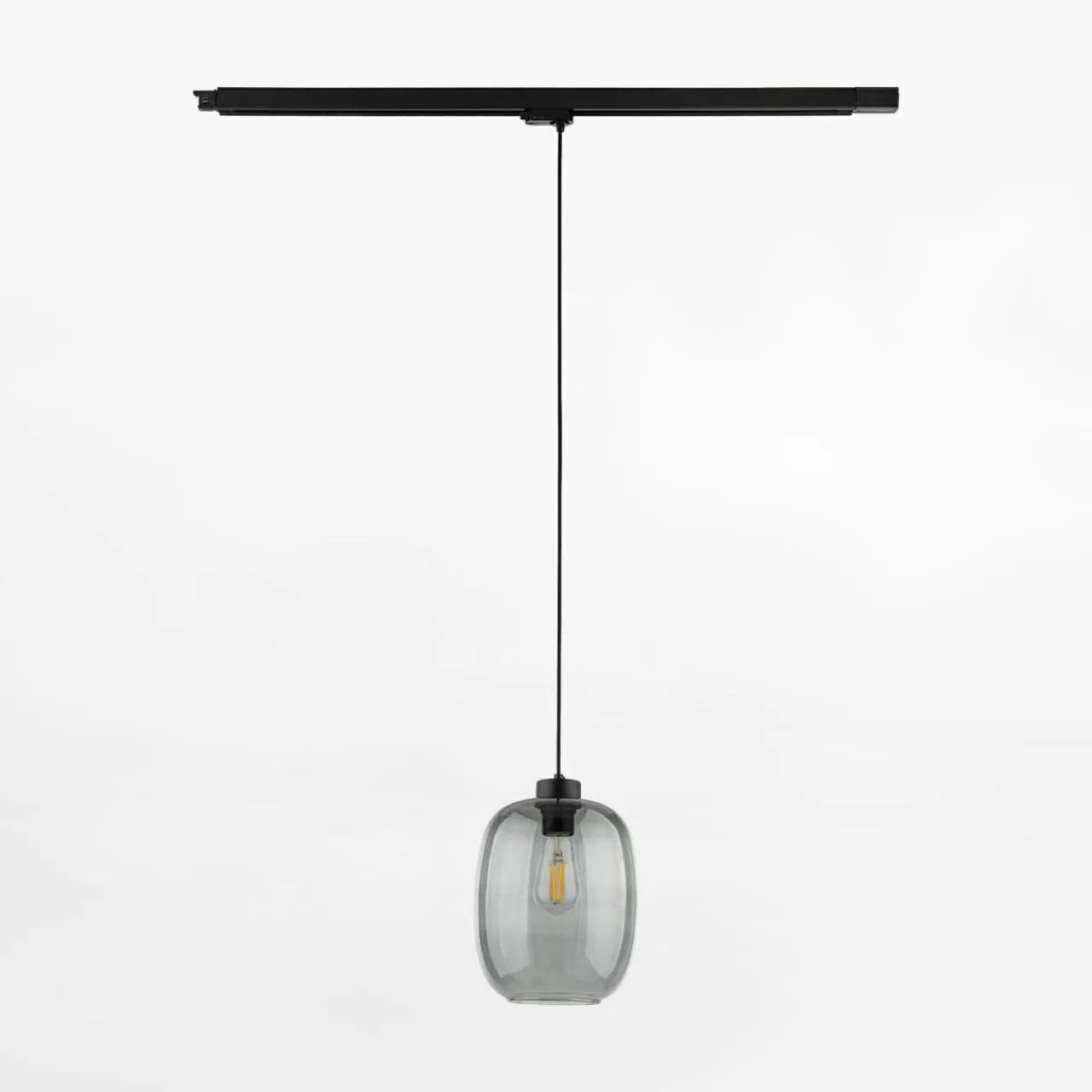 - Górna część oprawy i mocowanie do szyny są w czarnym, matowym kolorze. Dolna posiada grafitowy, lekko dekorowany klosz, który mieści 1 żarówkę typu E27.